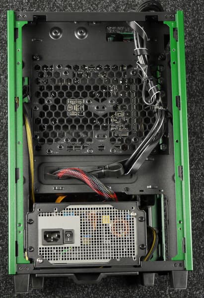 Особенность прокладки проводов от блока питания заключается в том, что шнуры с основным разъемом питания и разъемом питания процессора нужно поворачивать на 180 градусов относительно их выхода из корпуса БП, что увеличивает требуемую длину проводов. Для их прокладки предусмотрено место между кожухом и блоком питания, над последним. Ме́ста вполне достаточно, чтобы протянуть там шнуры вместе с разъемами без демонтажа кожуха.