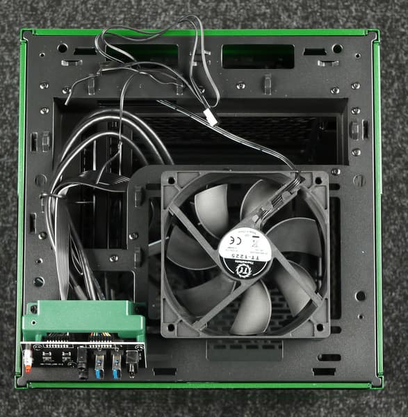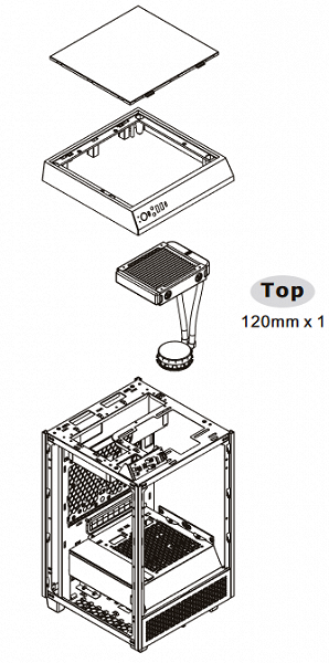 Сверху вместо вентилятора можно установить радиатор системы СЖО типоразмера 120 мм, но для данного оборудования корпус подходит не лучшим образом, так как ни модели на 140 мм, ни тем более модели с двумя вентиляторами установить нельзя.