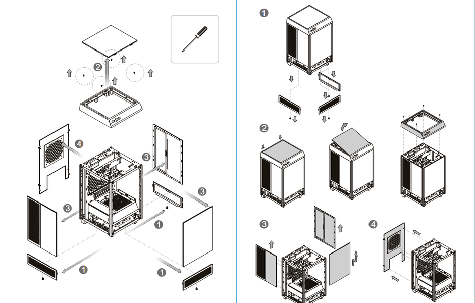 Подавляющее большинство компактных корпусов при сборке требуют большего количества манипуляций и затраченного времени по сравнению со сборкой в полноразмерных моделях. Сборка в данном случае начинается с почти полной разборки корпуса для дальнейшей установки компонентов системного блока и последующей сборки корпуса в обратной последовательности.