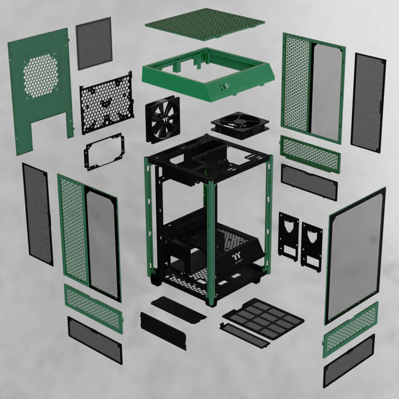 Корпус представляет собой решение башенного типа с вертикально размещаемой платой формата Mini-ITX и и нижнерасположенным блоком питания с горизонтальным размещением на дне корпуса около задней стенки. Блок питания может быть формата ATX, но при желании можно установить и SFX-модель через адаптер.