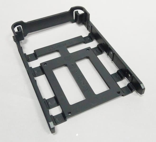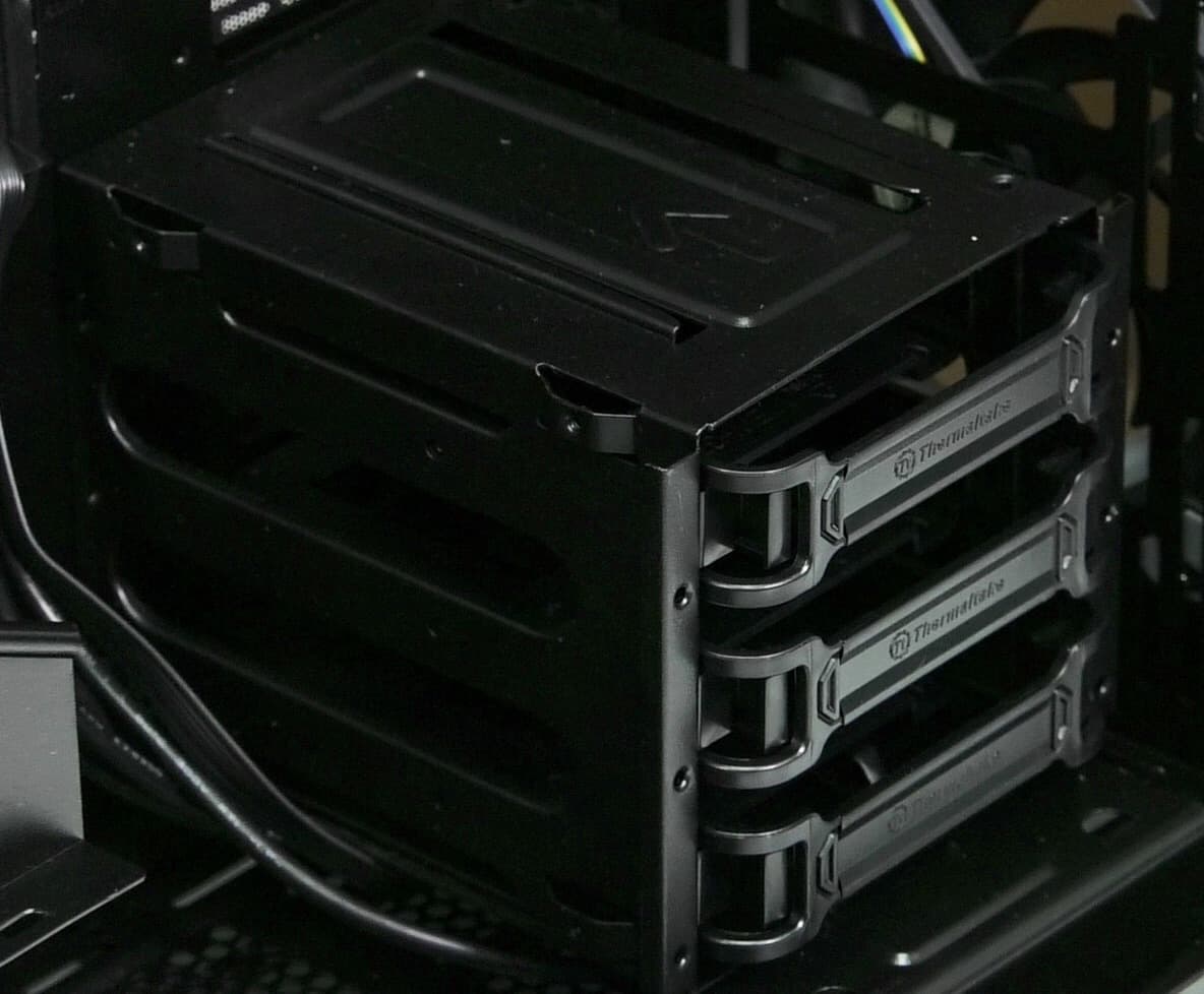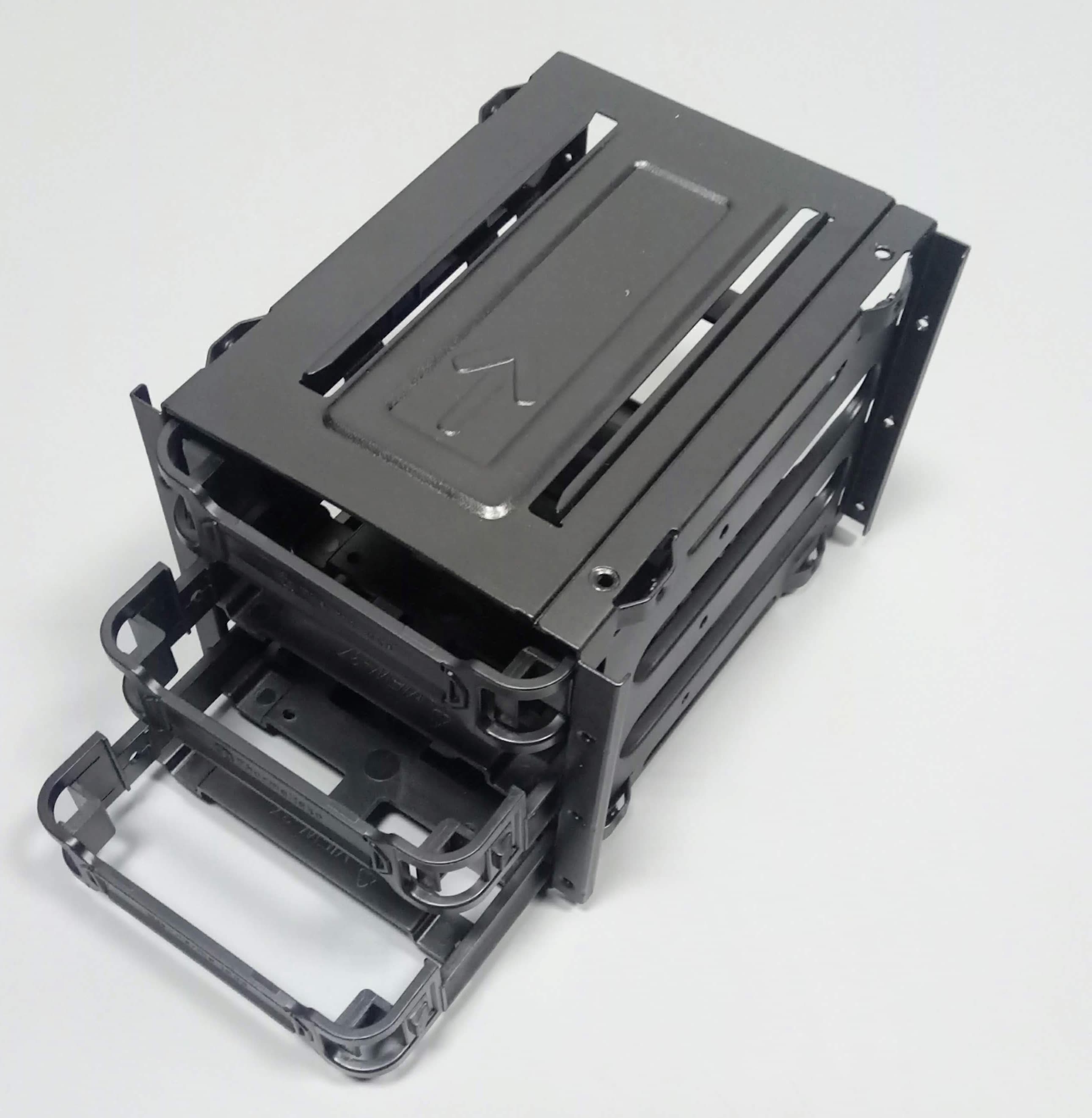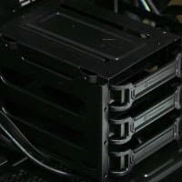 Полноразмерные жесткие диски устанавливаются в предназначенную для них трехместную корзину через пластиковые рамки. Диск крепится к ним с помощью винтов. Фиксируются рамки простым защелкиванием, надежность крепления достаточно высокая.