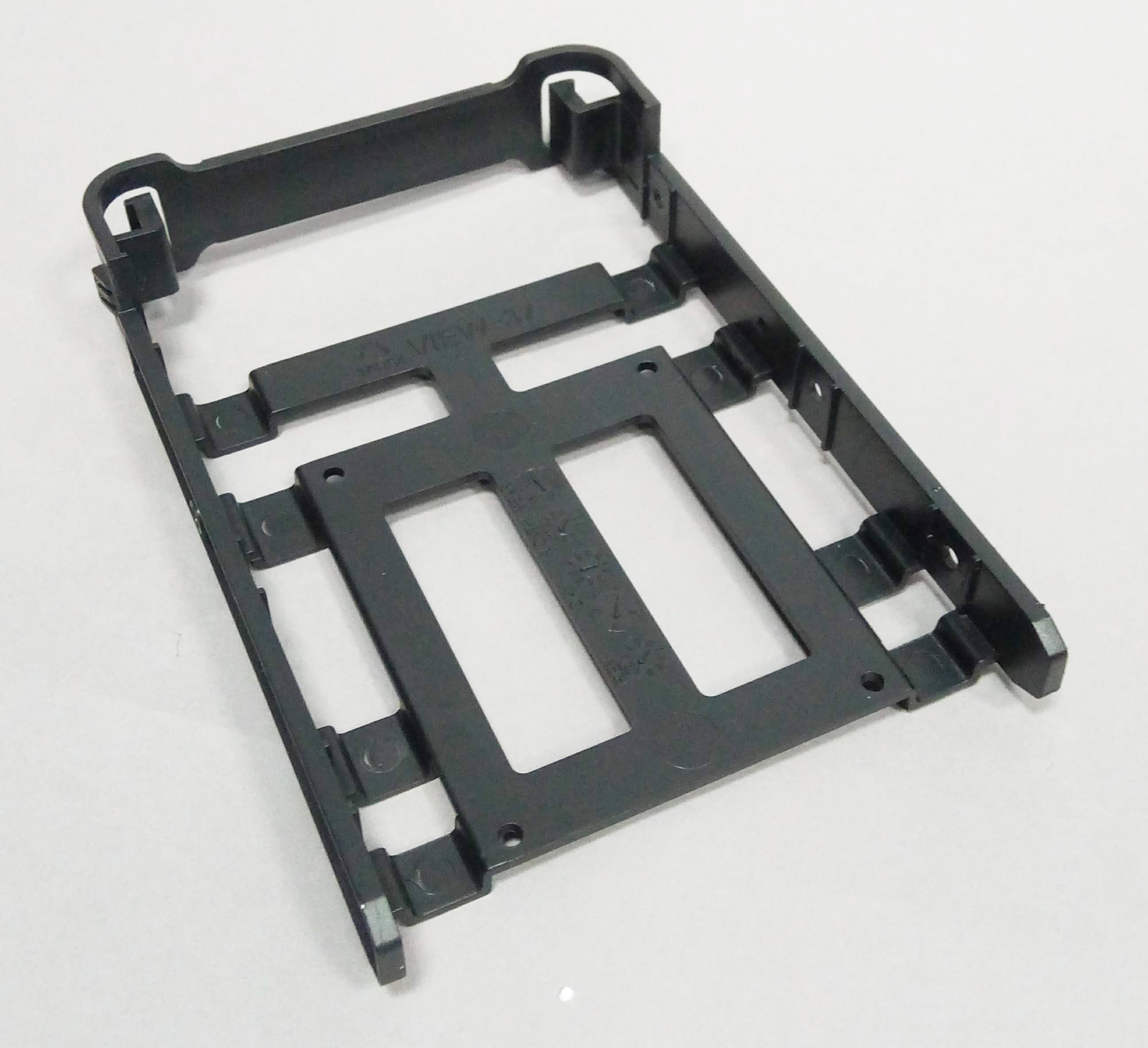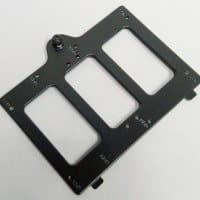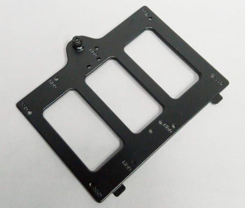 Также для накопителей предусмотрены четыре быстросъемных контейнера в виде монтажных пластин, которые установлены на обратной стороне основания для системной платы. Крепление контейнеров осуществляется за счет монтажных отверстий, которые цепляются за пару выступов. Контейнеры дополнительно фиксируются винтами с накатной головкой. В данном случае контейнеры универсальные, они позволяют устанавливать диски 3,5″ или 2,5″ на выбор. На каждую пластину можно установить один накопитель формата 3,5″ или два накопителя 2,5″.
