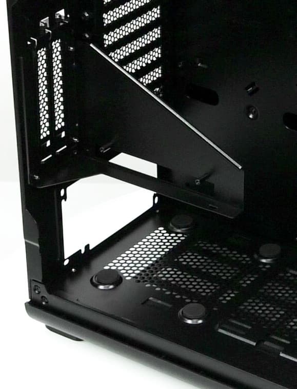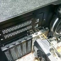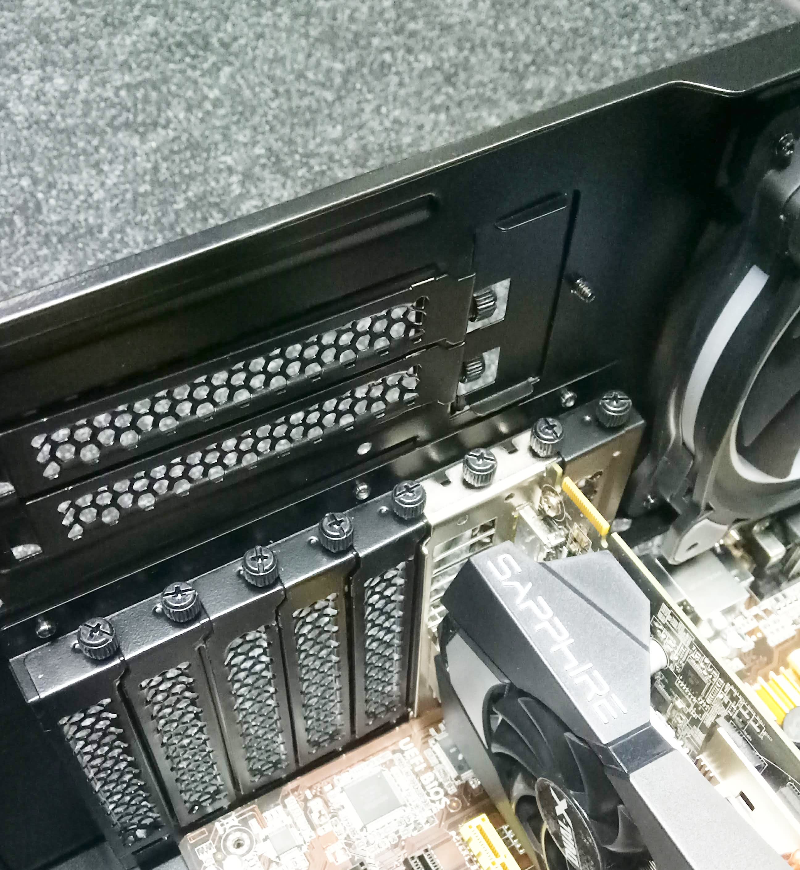 Далее можно установить требуемые платы расширения, например видеокарту, которая может достигать в длину около 44 сантиметров, если объем корпуса между системной платой и передней стенкой шасси ничем не занят, в противном случае остается около 33 сантиметров свободного места. Система фиксации тут самая обычная — крепление на винтах изнутри корпуса.