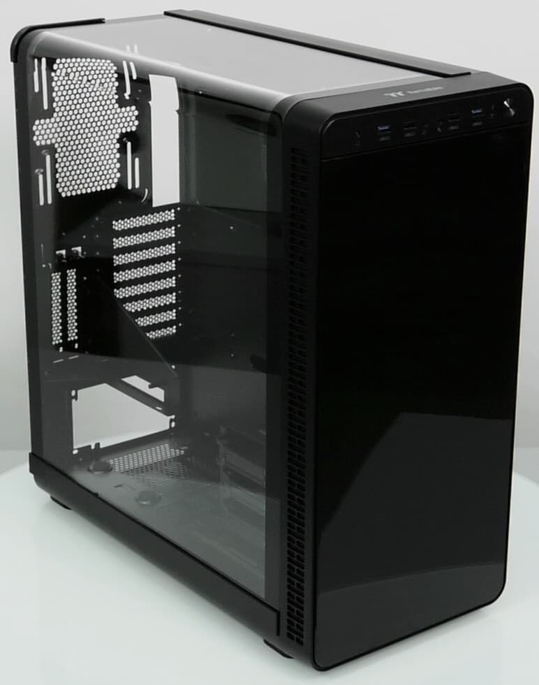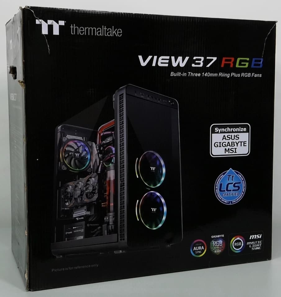 Сегмент «прозрачных» корпусов на рынке имеет довольно устойчивую тенденцию к расширению. Тут есть разные варианты исполнения как с точки зрения используемых материалов, так и с точки зрения количества «иллюминаторов», которых может быть от одного до четырех. Популярным дополнением таких корпусов являются вентиляторы с подсветкой RGB-светодиодами, которыми комплектуют свои продукты почти все производители. Разумеется, компания Thermaltake не оказалась в стороне от моды, и в ее ассортименте можно встретить «прозрачные» корпуса серии View, которые оснащаются вентиляторами с многоцветной подсветкой. Ранее мы уже знакомились с корпусом View 31, который имел в своей конструкции стеклянную стенку и полупрозрачную переднюю панель из пластика. Концепция модели View 37 несколько отличается. Тут используются только пластиковые элементы, при этом боковая прозрачная панель охватывает еще и верхнюю часть корпуса, расширяя визуально объем и улучшая обзор компонентов. Подобное решение даже можно считать эксклюзивным на данный момент времени.