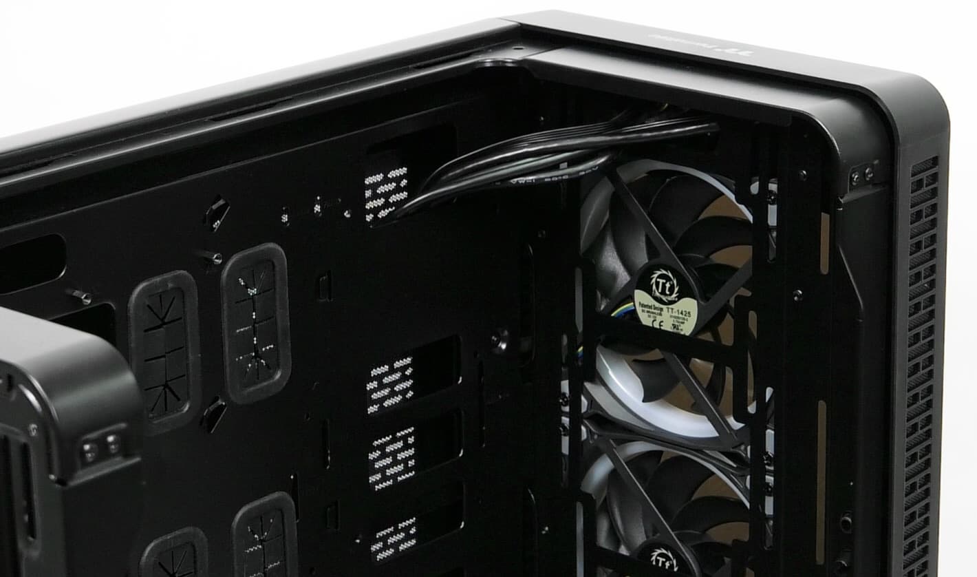 Предустановлены в корпусе три вентилятора типоразмера 140 мм на передней панели. Все вентиляторы — с ШИМ-управлением, они подключаются к контроллеру через фирменный десятиконтактный разъем с колодкой 5×2.