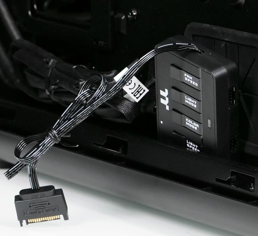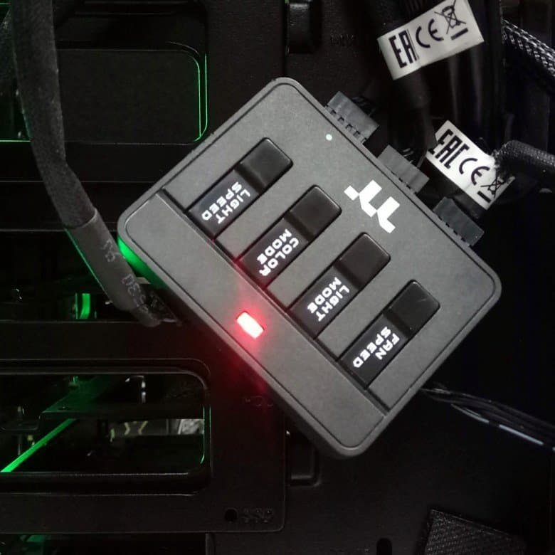 В случае, если системная плата не поддерживает управление подсветкой корпуса, у контроллера есть свои органы управления в виде четырех кнопок, три из которых управляют режимом подсветки, а четвертая представляет собой электронный двухпозиционный переключатель скорости вращения вентиляторов.