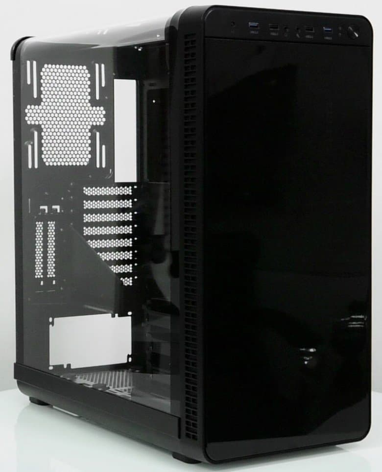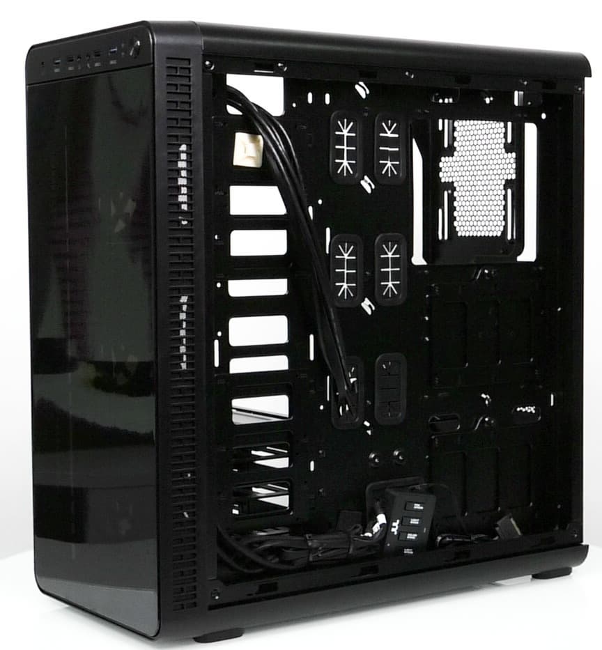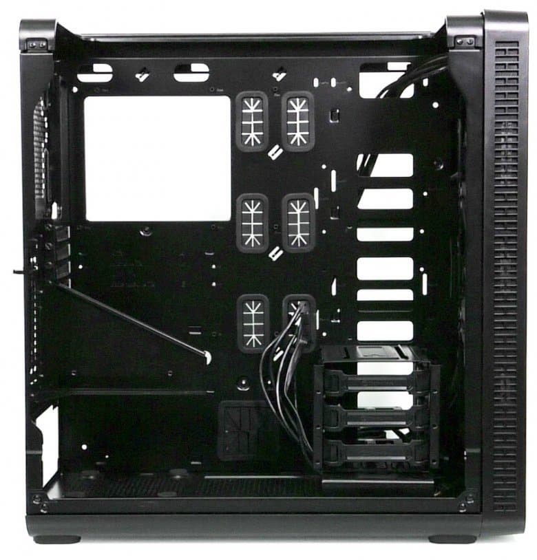 Компоновочные решения данной модели определяются современными тенденциями корпусостроения. В данном случае разработчики отказались от отсека для устройств формата 5,25″, а привычный отсек для устройств 3,5″ расположен около передней стенки шасси, но присутствует он в усеченном виде — всего на три диска.