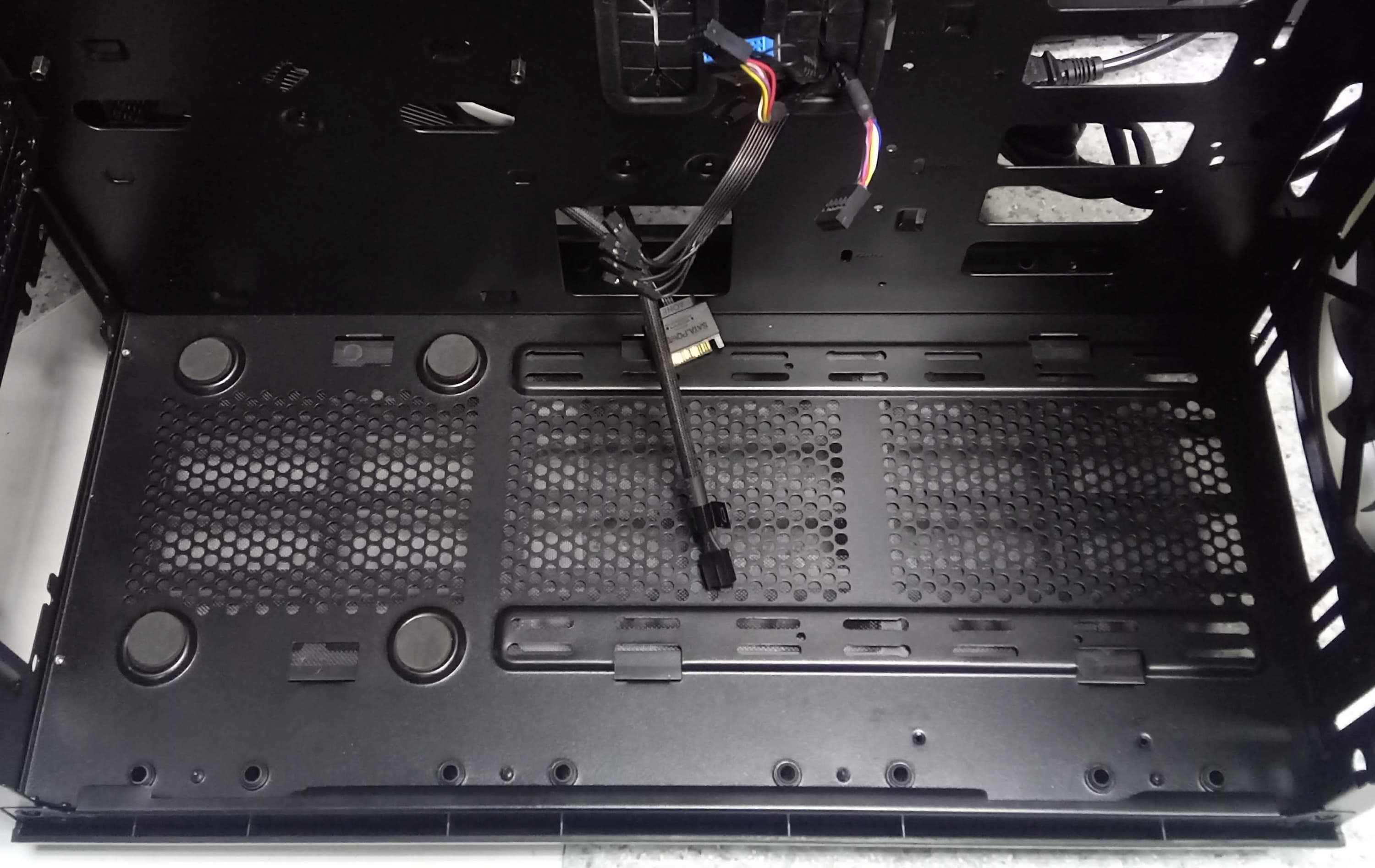 На оборотной стороне основания для системной платы также присутствуют места для установки накопителей. А вот посадочные места для накопителей с внешним доступом в корпусе полностью отсутствуют.