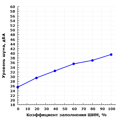 Уровень шума системы охлаждения изменяется от 25,5 до 39 дБА при расположении микрофона в ближнем поле. При значении коэффициента заполнения ШИМ менее 20% шум системы охлаждения корпуса находится на пониженном уровне, а при КЗ от 40% до 80% шум среднетипичный для жилого помещения в дневное время суток.