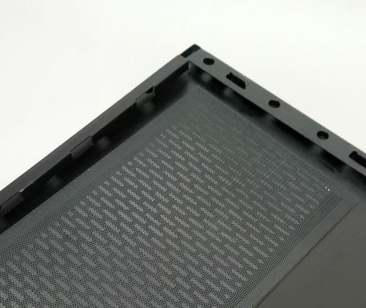 Пылевые фильтры в корпусе есть, но не все они обеспечат хорошую фильтрацию воздуха от пыли. Фильтр на нижней стенке шасси выполнен из мелкой синтетической сетки, которая заключена в пластиковую рамку. Его можно считать быстросъемным, так как для его извлечения не требуется каких-либо дополнительных действий. Упомянутый выше фильтр на боковой стенке более эффективно размещать снаружи корпуса, так как в этом случае его можно быстро снять и промыть под струей воды. На торцах передней панели также есть элементы из проштампованного пластикового листа, которые выполняют роль пылевого фильтра, но претензия тут точно такая же: ячейки довольно крупные, мелкую пыль они будут пропускать внутрь корпуса, а очищать сетку не очень удобно. С другой стороны, система фильтрации здесь далеко не самая плохая, все критичные места прикрыты.