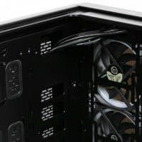 В корпусе реализована разветвленная система подсветки, которая включает три вентилятора с кольцевой подсветкой и контроллер с возможностью расширения. В модификации View 37 RGB Edition (которую мы тестировали) корпус оснащен тремя вентиляторами Riing Plus с 12 адресуемыми светодиодами в каждом, которые и обеспечивают RGB-подсветку. Еще существует модификация Riing Edition, которая оснащена двумя вентиляторами с одноцветной (синей) подсветкой.
