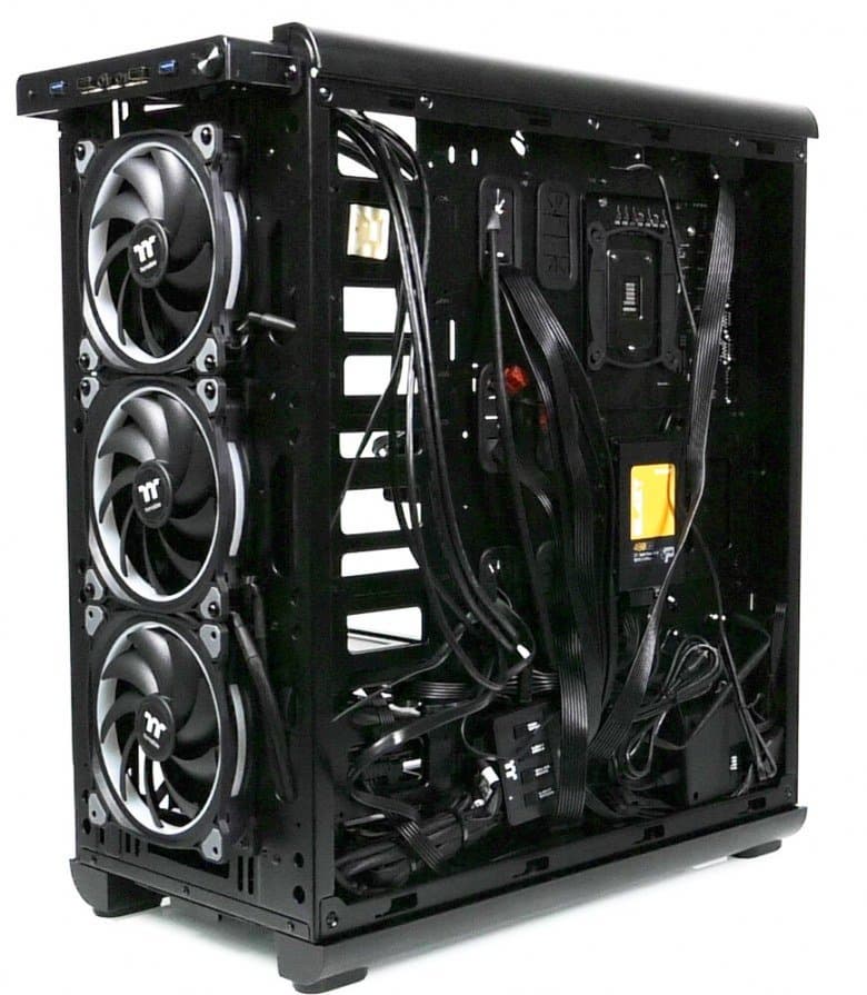 Отметим, что три посадочных места находятся с правой стороны корпуса, там же имеется и съемный фильтр из проштампованного пластмассового листа. Имеется возможность установить три радиатора вместо вентиляторов спереди, сзади и сбоку.
