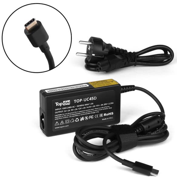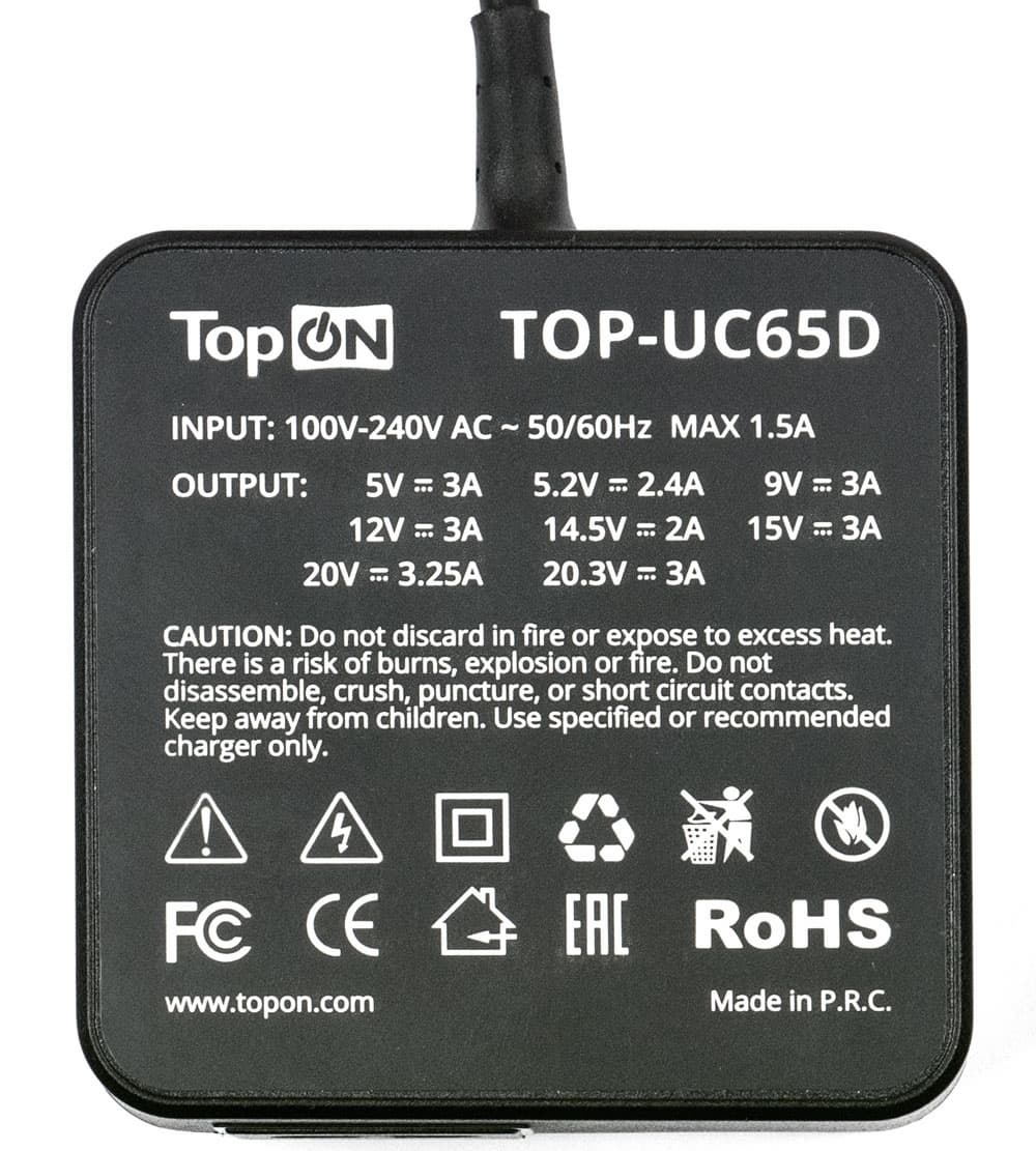 И даже в спектре продукции компании модели с поддержкой PD совсем новые, на официальном сайте информации минимум, даже фотографии появились, когда мы уже работали с блоком питания. Да и с обозначением есть путаница: на упаковке две надписи — на лицевой стороне покрупнее «Top-UCQ66», на нижнем торце помельче «Top-65WTC-D», но приведен код модели 102448, которому на сайте соответствует индекс Top-UC65D, он присутствует и в таблице с параметрами на тыльной стороне коробки, а главное — на корпусе самого устройства, поэтому именно его мы вынесли в заголовок.