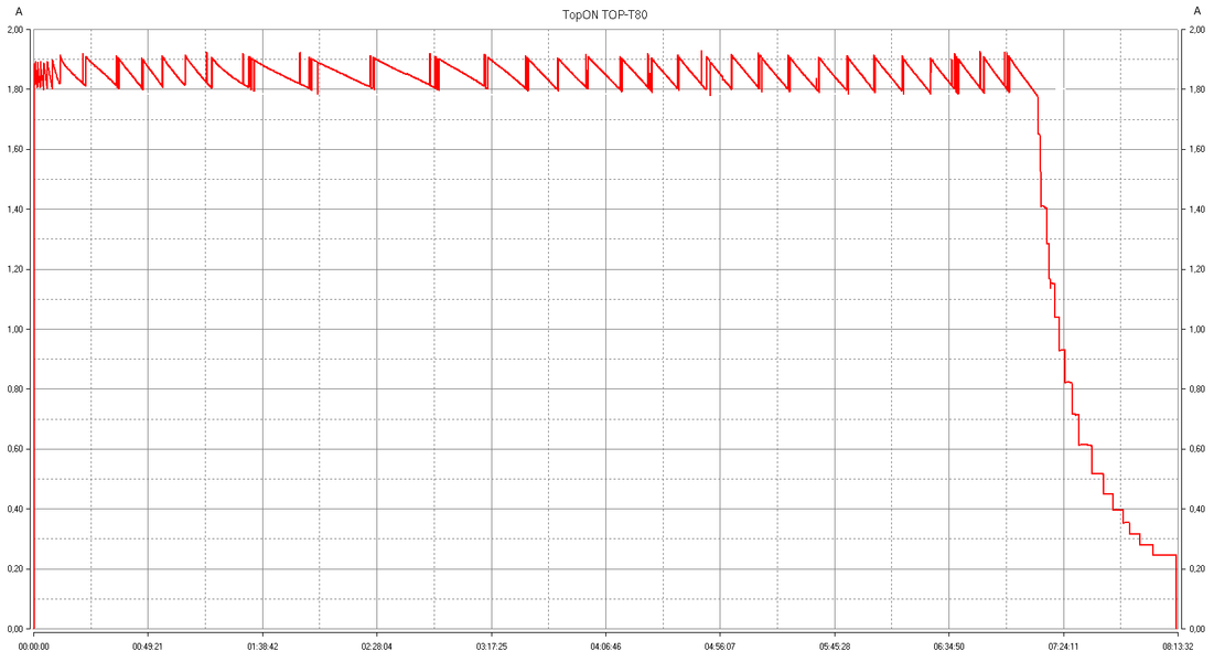 Форма кривой вполне соответствует общепринятой методике заряда li-ion-аккумуляторов в два этапа: сначала заряд постоянным током, затем падающим током при постоянном напряжении. И ток на первом этапе вполне приличный, около 1,8-1,9 А; немного выбиваются из «теории» лишь постоянные колебания зарядного тока, составляющие примерно 150 мА.