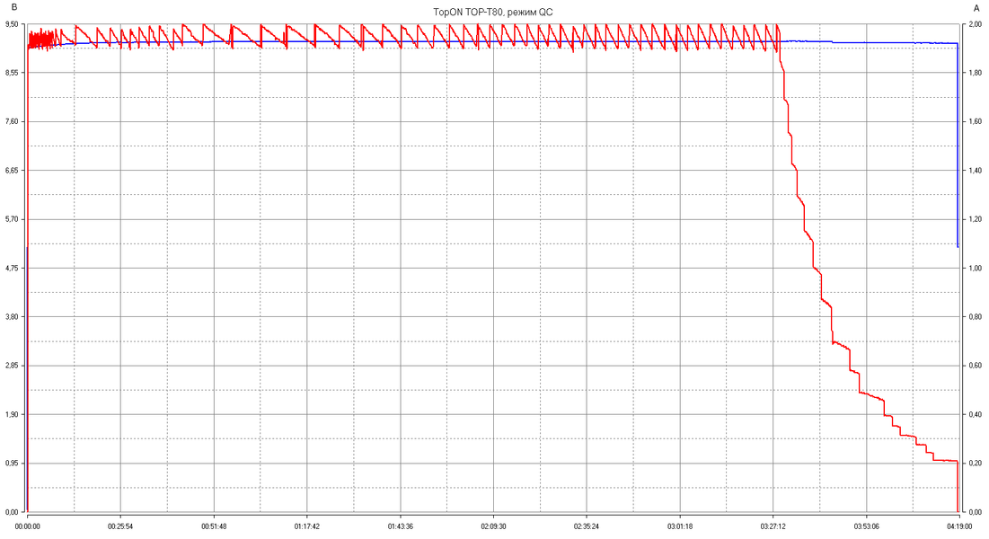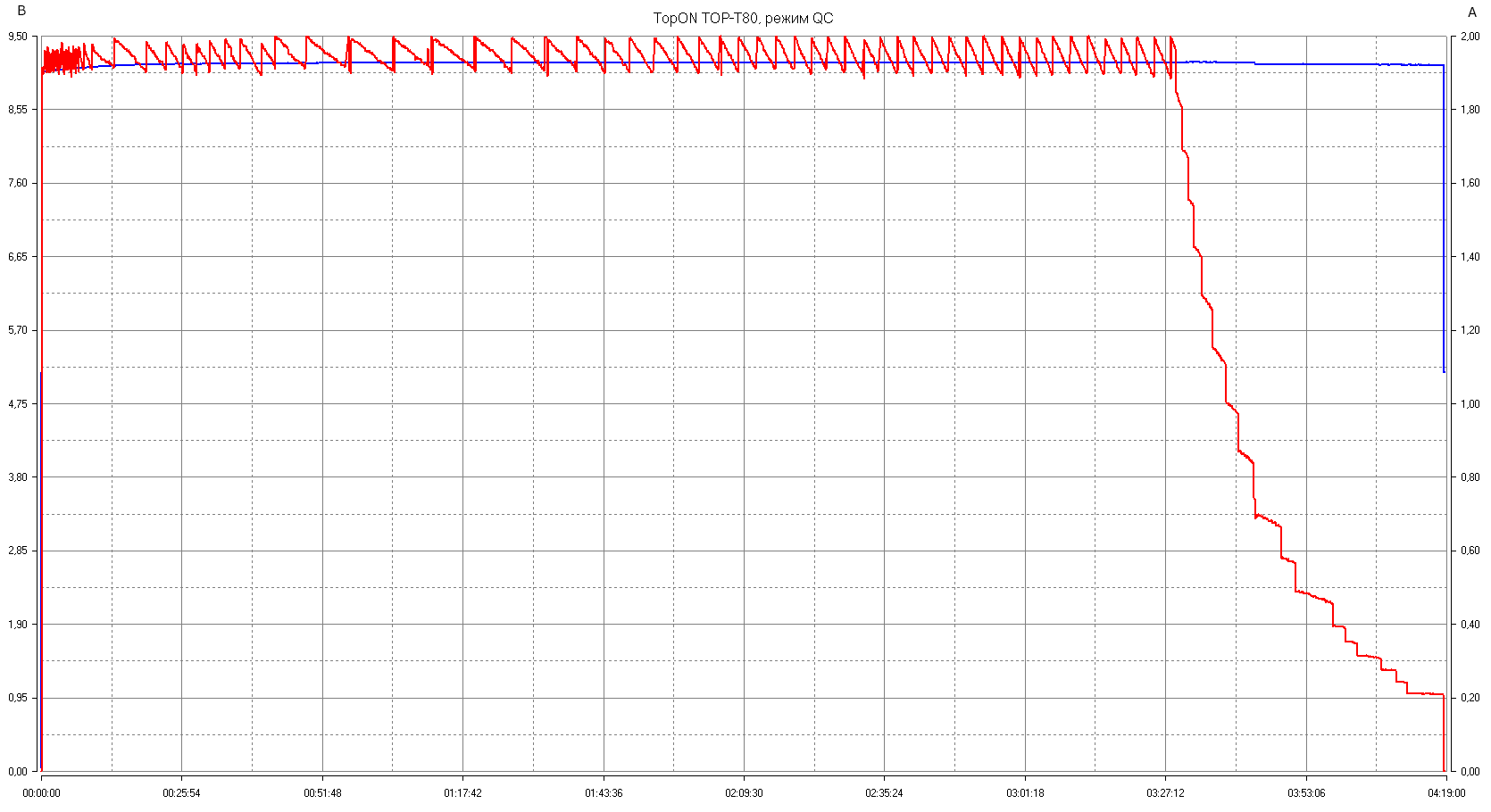 | Out1 QC 2.0 12 В | 2,0 A | 11,9 В | сразу начинает спадать: сначала плавно, в последние 10-11 минут быстро | плавно до 9,3 В быстро до 7,5 В | 2 часа 34 минуты | ≈48 Вт·ч | ≈73% |