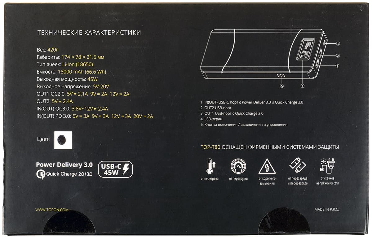 Поэтому компания TopON предложила новую модель TopON Top-T80, внешне очень похожую на Top-T72 и имеющую такую же ёмкость встроенной батареи, но поддерживающую современные технологии Quick Charge в версии не только 2.0 (она есть и в Top-T72), но и 3.0, а также Power Delivery 3.0. Соответственно в этом пауэрбанке уже нет набора переходников для ноутбуков и соответствующего выходного гнезда, нет и автомобильного адаптера для заряда самого пауэрбанка от автомобильной бортсети.
