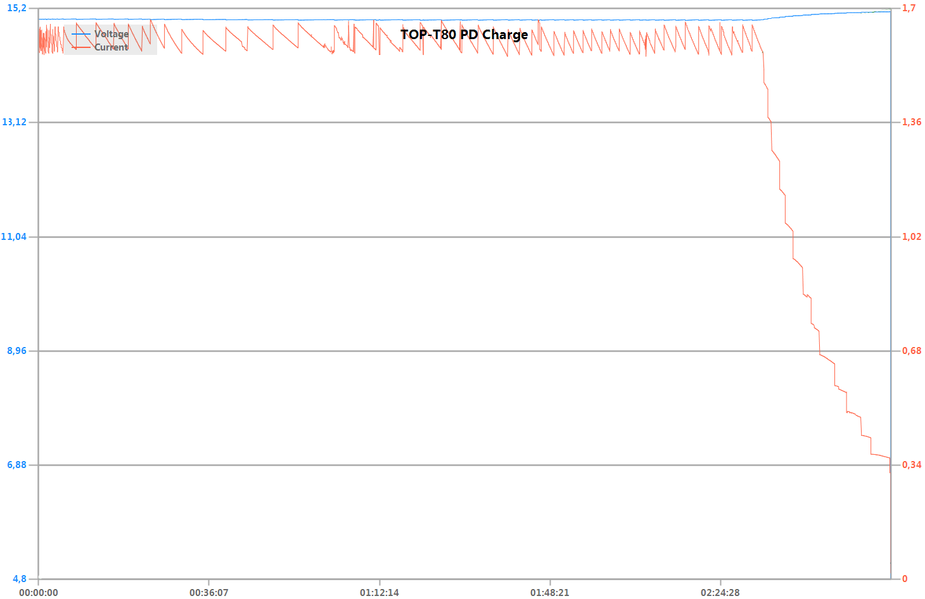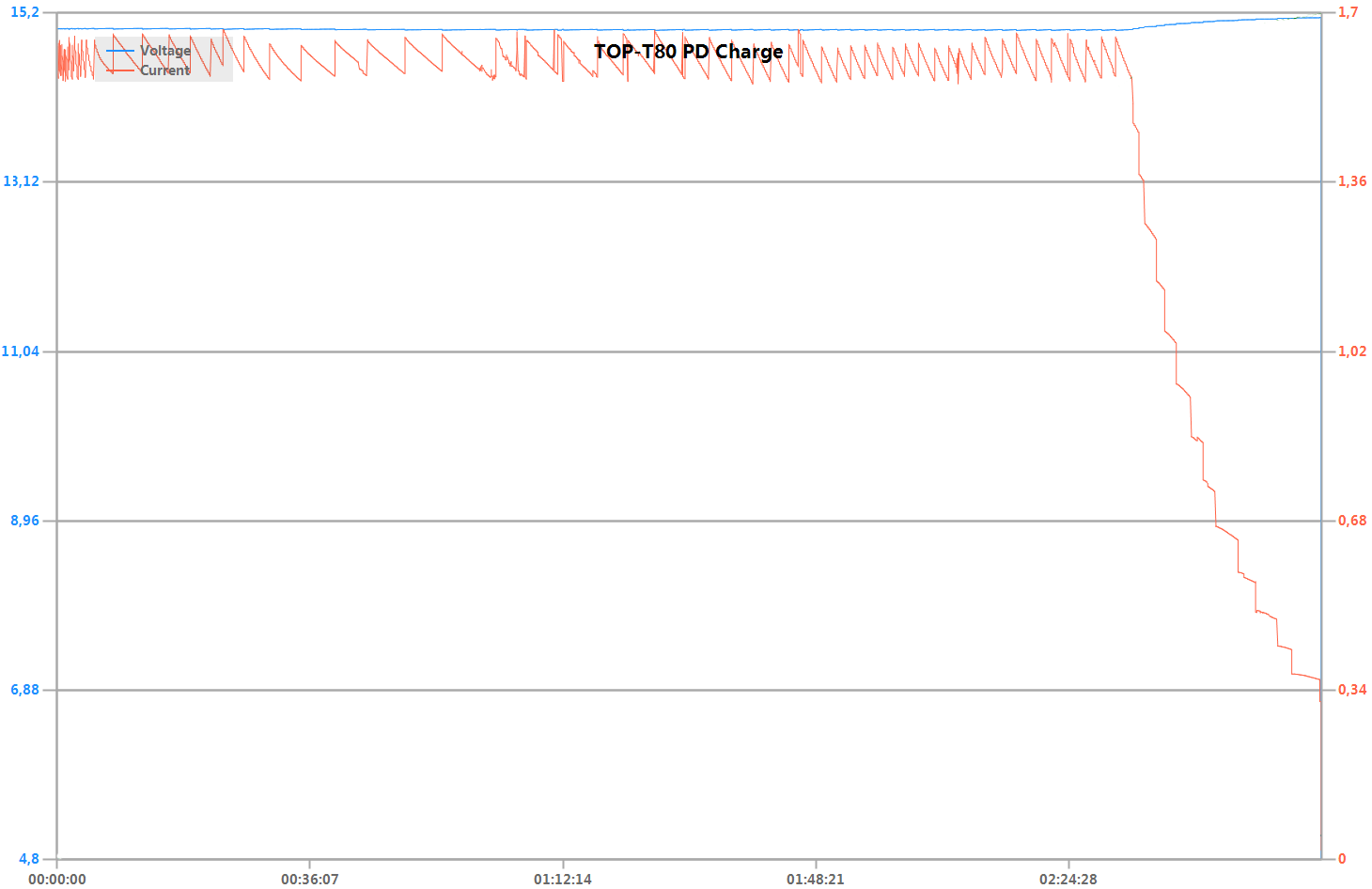 Для режима PD мы использовали другое оборудование, поэтому оформление графика немного отличается, хотя форма кривой тока (она красная) такая же, как и с другим зарядным устройством: