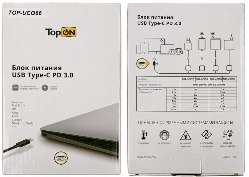 Такие ЗУ предлагаются в том числе и компанией TopON, одну из моделей, блок питания TopON Top-UC65D, мы также рассмотрим. Правда, он поддерживает только Power Delivery (PD) в версии 3.0, но адаптер с поддержкой и этой технологии, и Quick Charge (QC) найти не так уж просто.