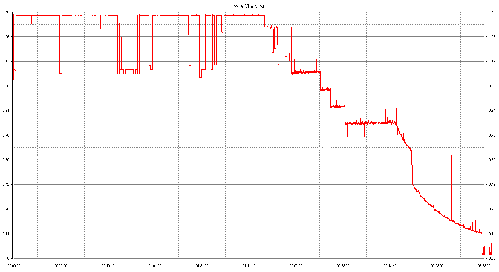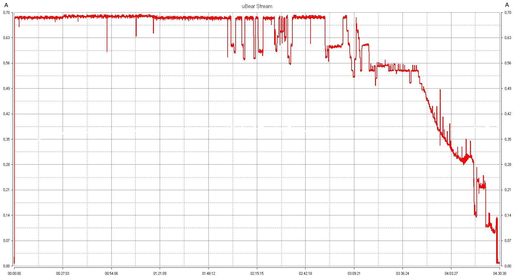 График потребляемого ЗУ тока в процессе заряда гаджета снят в следующих условиях: напряжение питания BS — 9 В (режим QC), точно по центру уложен смартфон с батареей 3330 мА·ч, разряженной почти полностью (остаток 2%-3%), без SIM-карты и с отключенными интерфейсами связи (Wi-Fi, Bluetooth и т. д.), экран постоянно включен со средней яркостью и запущено приложение Ampere для контроля процесса заряда. USB-тестер подключен на выходе сетевого адаптера, далее с помощью штатного кабеля подключается ЗУ uBear.