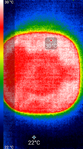Сделали замер и с тестовым смартфоном, заряжая его от почти разряженного состояния (остаток заряда 4%-5%) в течение часа, затем сняли гаджет и измерили температуру поверхности BS. Нагрев относительно исходного состояния составил 15-16 градусов — больше тех 12, которые допускает спецификация Qi, но надо учитывать дополнительный подогрев от самого смартфона.