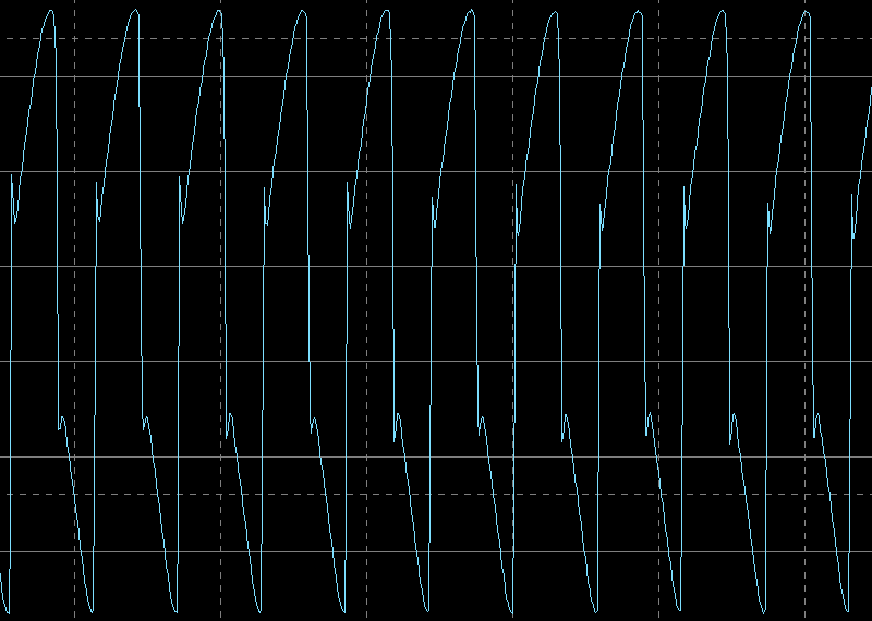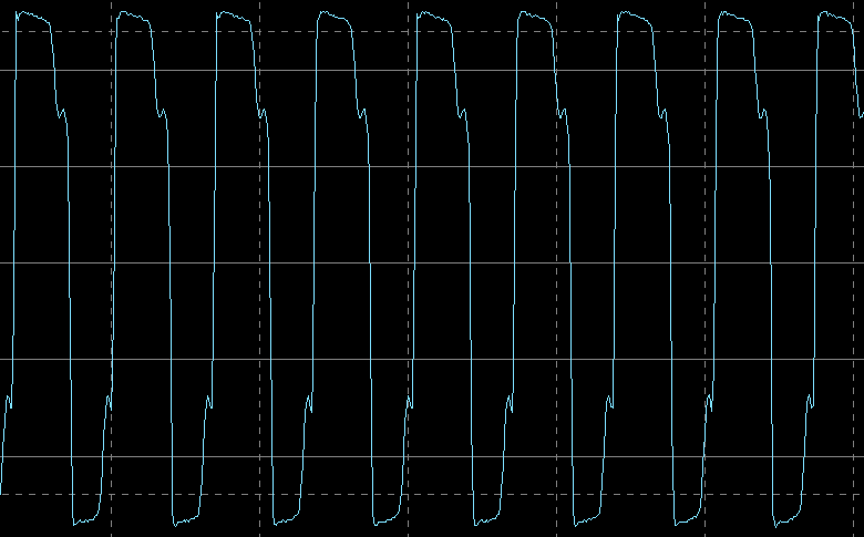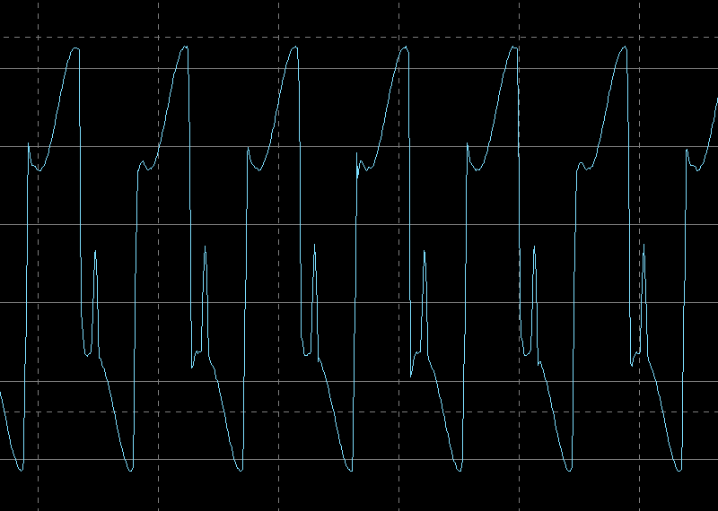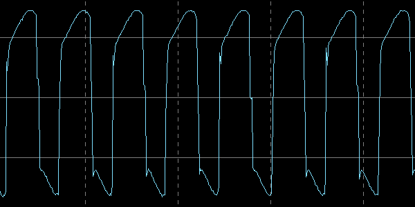 Осциллограф мы подключили непосредственно к контактам катушки приемника измерителя, благо они доступны. На всех приведенных ниже осциллограммах цена деления 5 В по вертикали и 10 мкс по горизонтали.