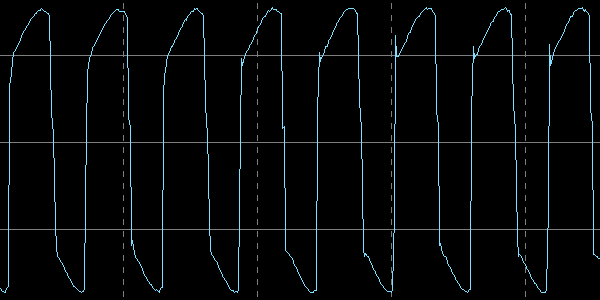 А что будет, если немного смещать измеритель? Пробуем при нагрузке 3 Вт сдвинуть его в сторону на 5-6 мм — показания ЖК-индикатора при этом не меняются сколь-нибудь заметно, да и осциллограммы очень похожи, разве что размах немного уменьшился.