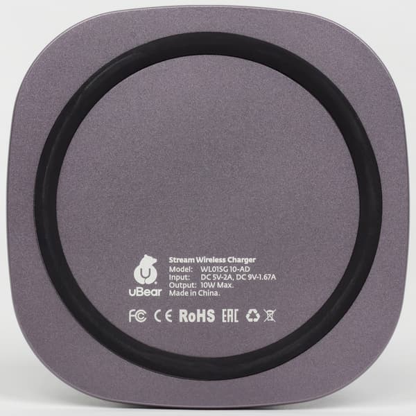Форму ЗУ uBear Stream можно определить как близкую к квадрату 10×10 см с сильно скругленными углами; толщина небольшая, всего 7 мм. Конструкция подразумевает горизонтальное расположение и зарядного устройства, и гаджета на нем.
