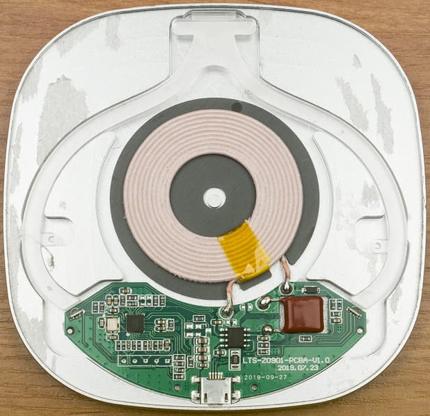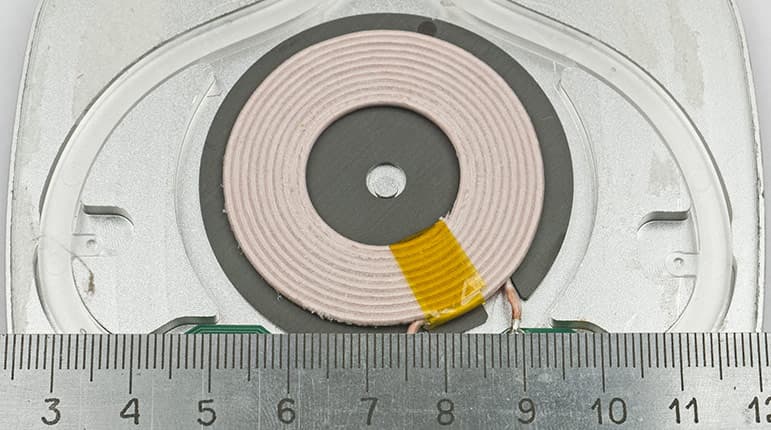 Сама катушка имеет размеры и конструкцию, промежуточные между приведенными в спецификации Qi примерами вторичных катушек, рассчитанных на мощности до 12 и 15 Вт. Поэтому оценить ее предел можно в 13-13,5 Вт (далее будет видно, что большей мощности мы и не получили).