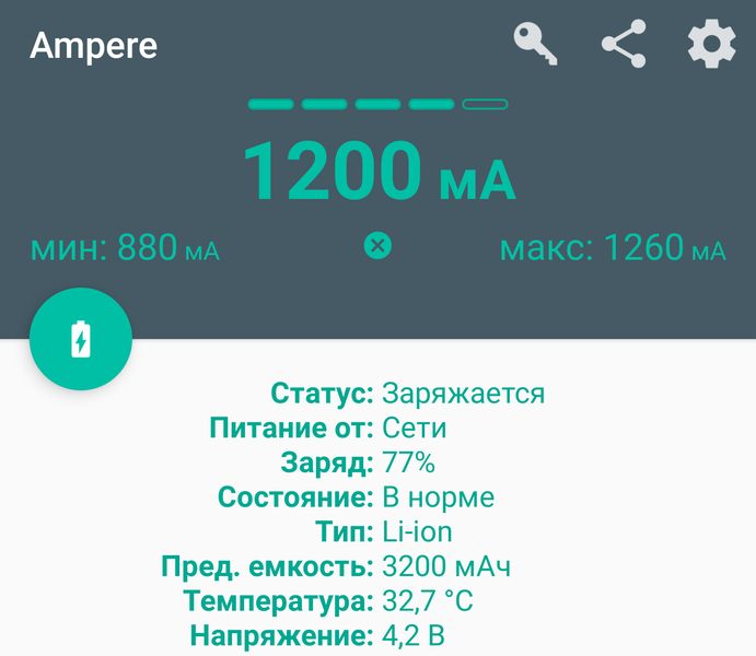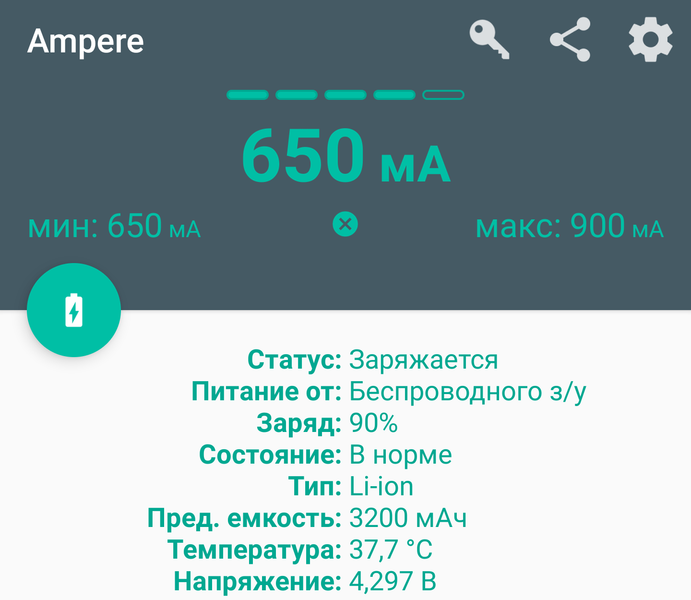 Контролировались токи: на входе BS (с помощью USB-тестера) и заряда аккумулятора MD (с помощью приложения Ampere для Android).