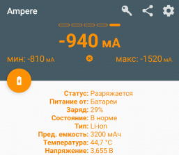 При этом отображаемые в Ampere температуры были заметно ниже: аккумулятор, конечно, при заряде нагревался, но в данном случае отсутствовал подогрев со стороны BS. Ниже приведены скриншоты с максимальными значениями: