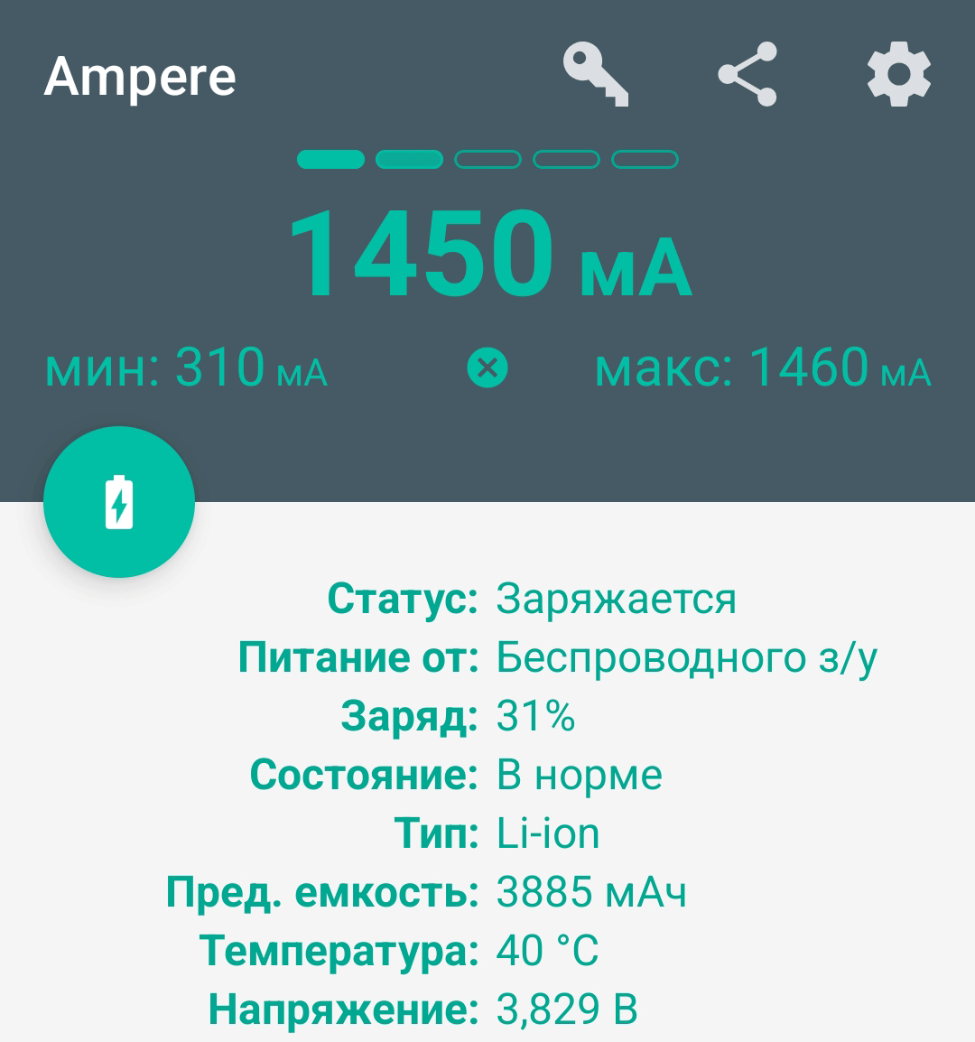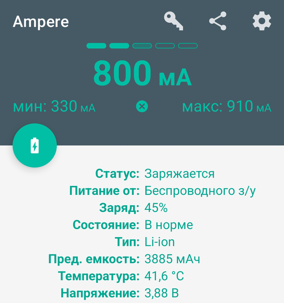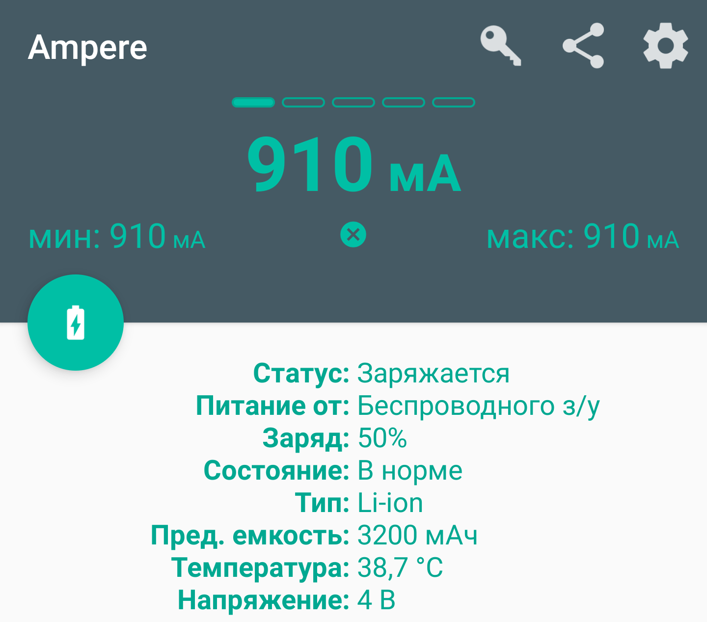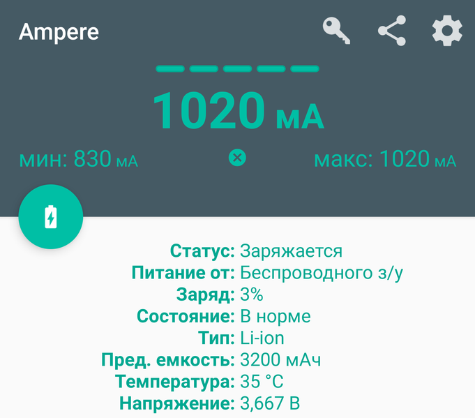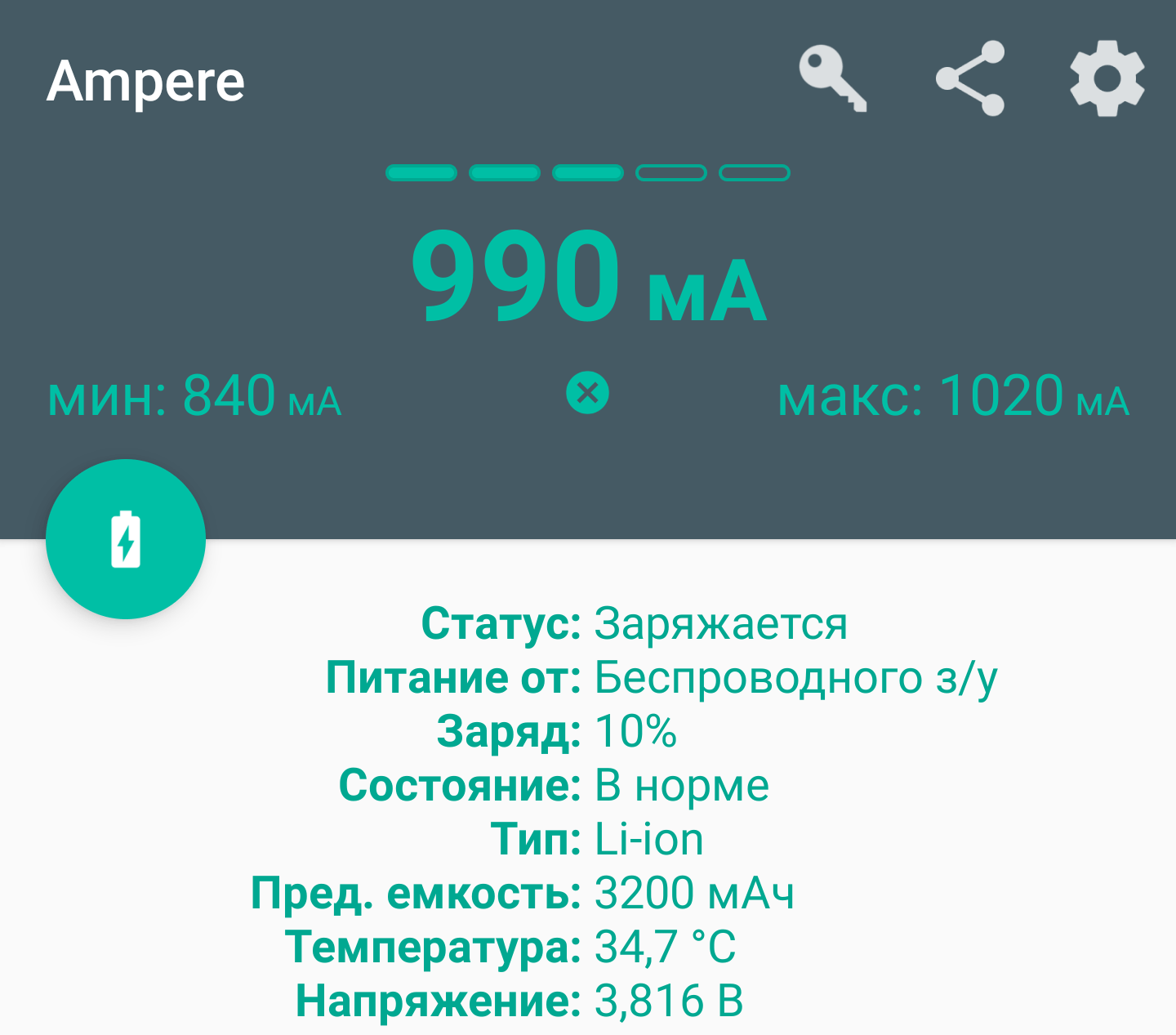 Очень постепенное снижение началось лишь через час — так, заряд восстановился до 50% за 1 час 14 минут, к этому времени ток по показаниям Ampere уменьшился до 1,5 А.