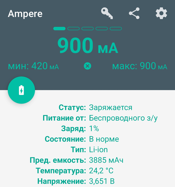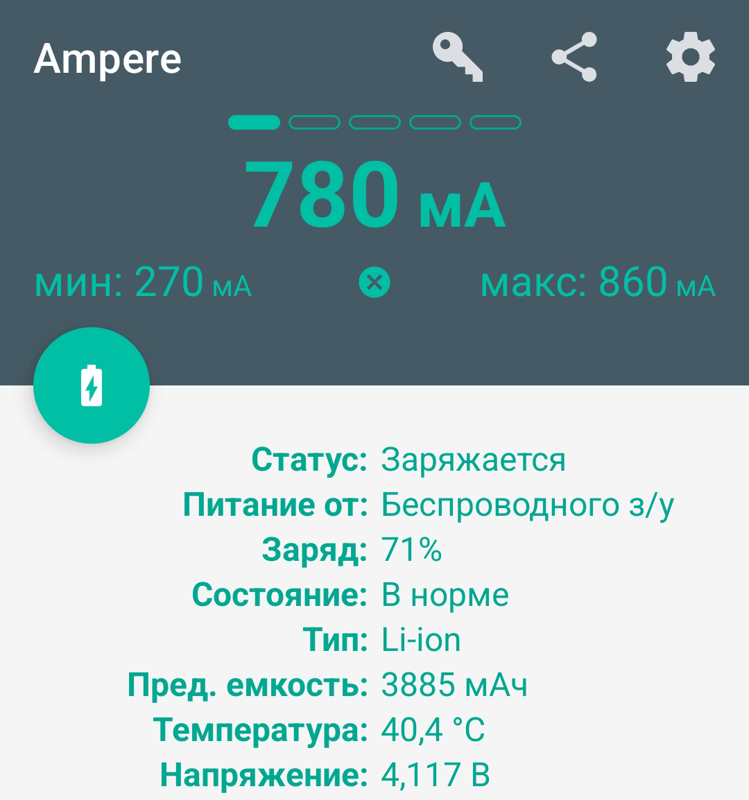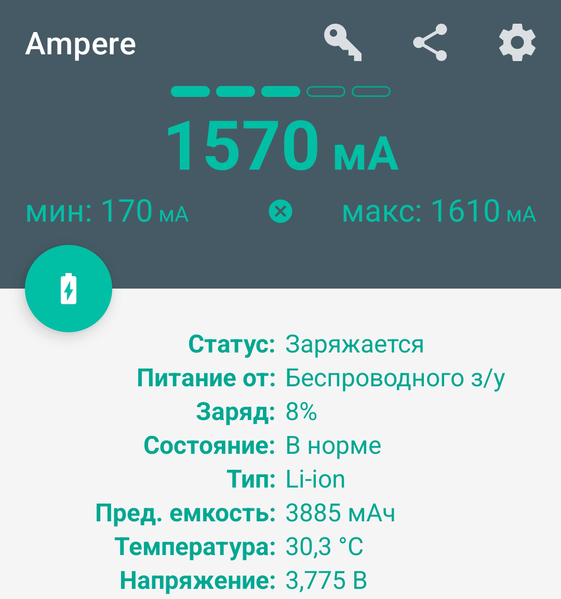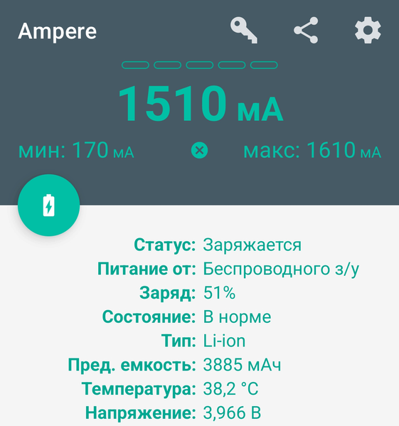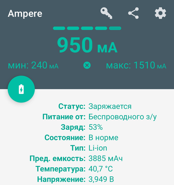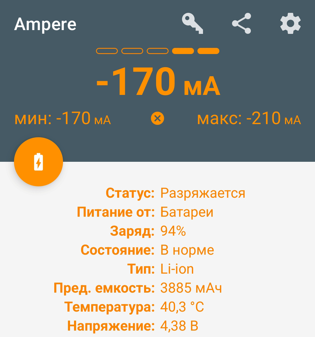 Очень постепенное снижение началось лишь через час — так, заряд восстановился до 50% за 1 час 14 минут, к этому времени ток по показаниям Ampere уменьшился до 1,5 А.