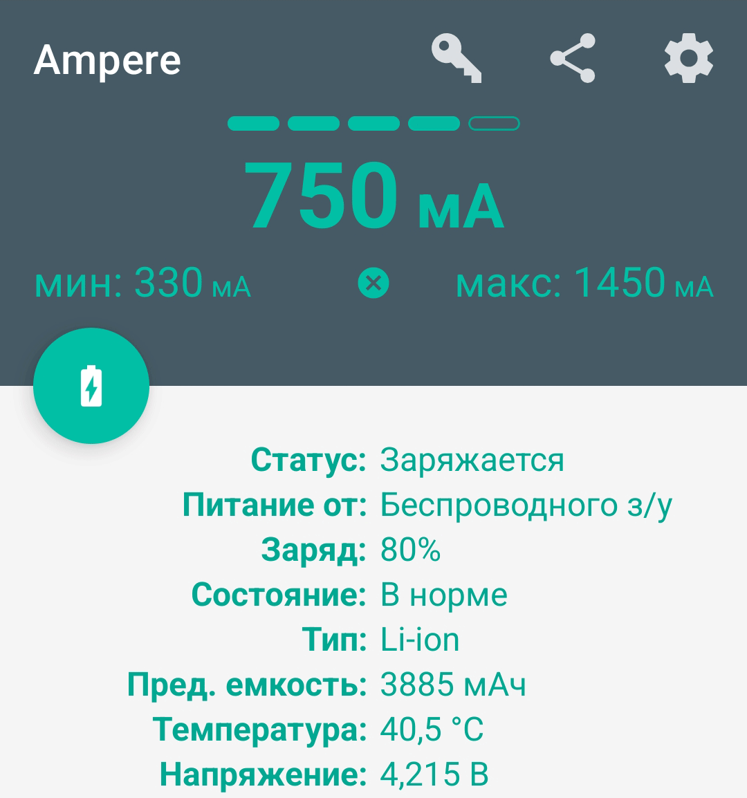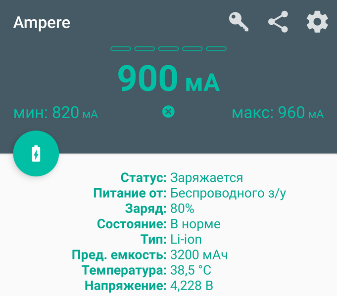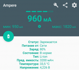 Начальный ток заряда около 1 А (при потреблении от внешнего ЗУ 0,4-0,5 А), ситуация почти не менялась долгое время: через 2,5 часа от начала уровень заряда достиг 80%, а ток был на уровне 900-930 мА.