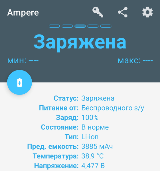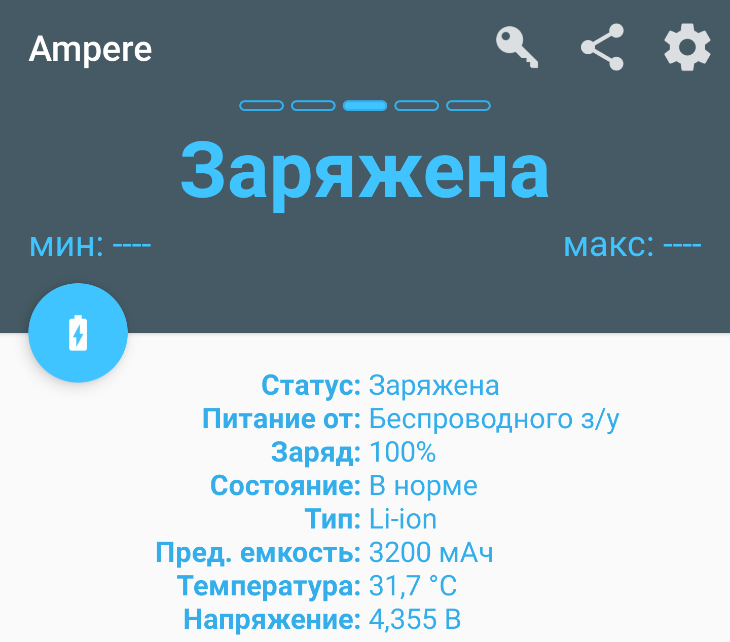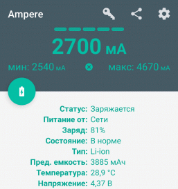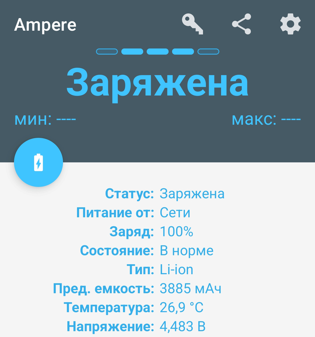 Уровень 80% был получен за 1 час 58 минут, 90% — за 2 часа 15 минут (ток 1,35 А). Показатель 100% появился через 2 часа 35 минут, почти сразу статус в приложении поменялся на «Заряжено».