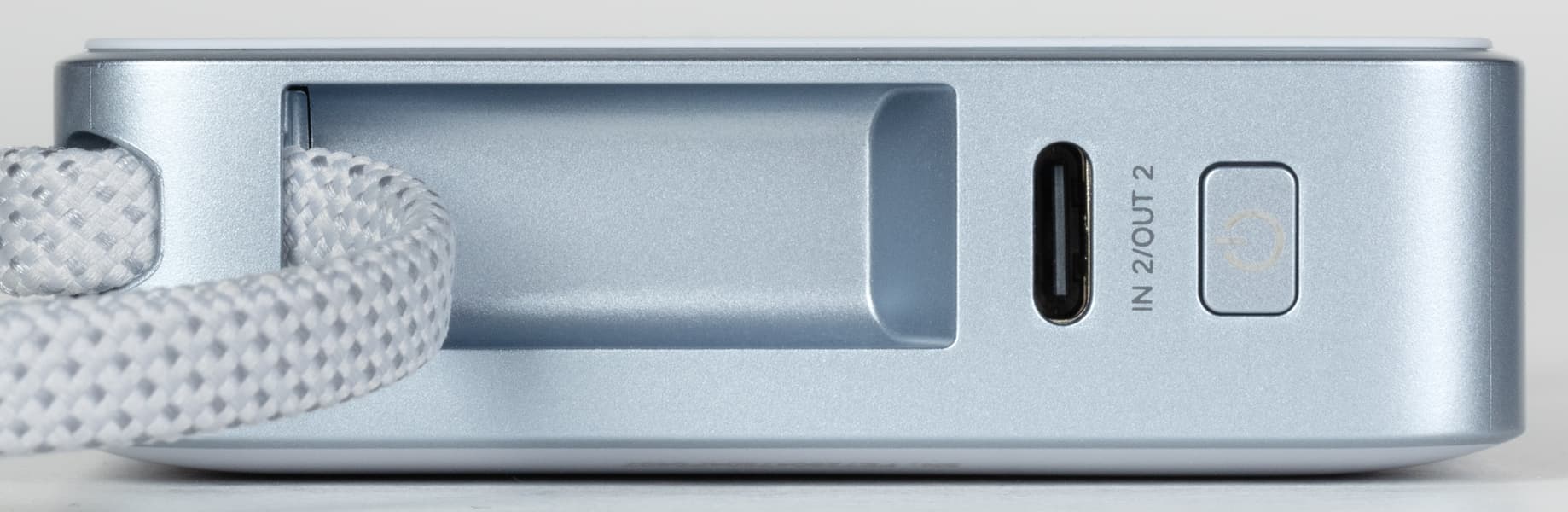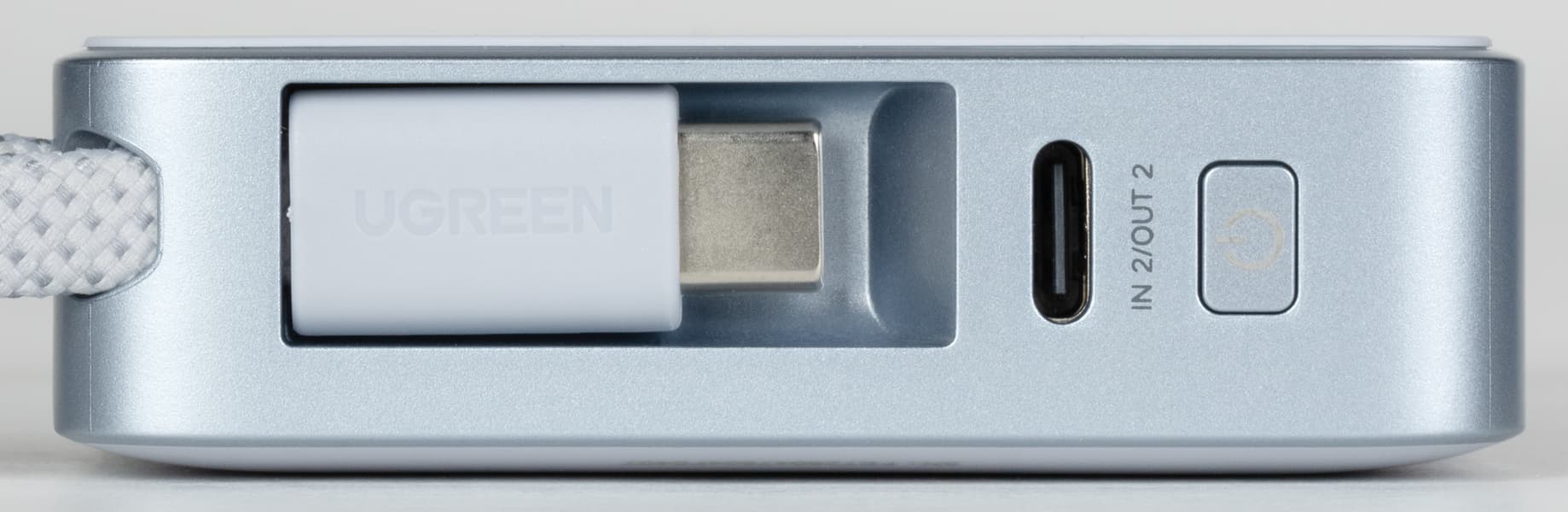 На примыкающем коротком торце имеется единственная управляющая кнопка, гнездо Type-C female (также может использоваться как вход и выход), а также ниша для укладки коннектора встроенного кабеля, в которой он удерживается магнитом.
