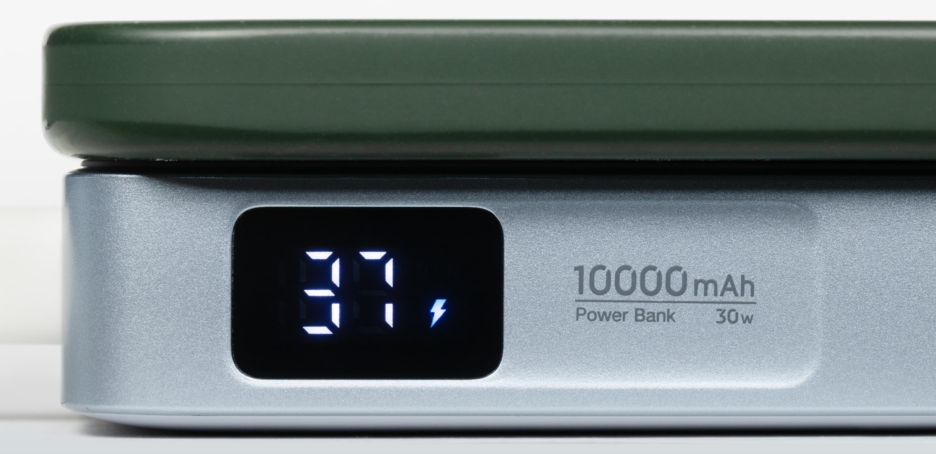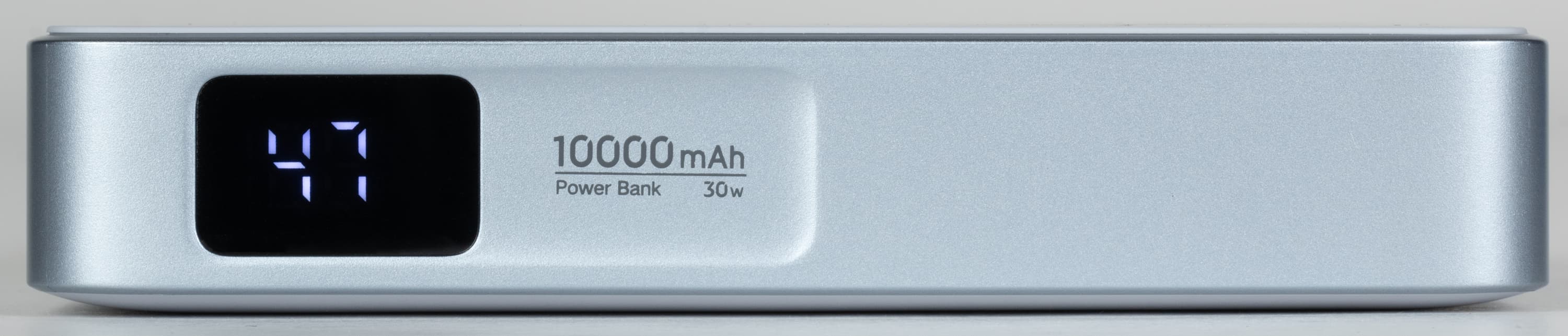 На одной из длинных боковых сторон находится индикатор, цифрами показывающий текущий уровень заряда и соответствующими символами — задействование режимов быстрой зарядки и беспроводного заряда. Цифровая часть (2,5-разрядная семисегментная, белого цвета, достаточно яркая) может также отображать некоторые состояния — перегрев (мигает «188») и перегрузку (мигает «ICP»).