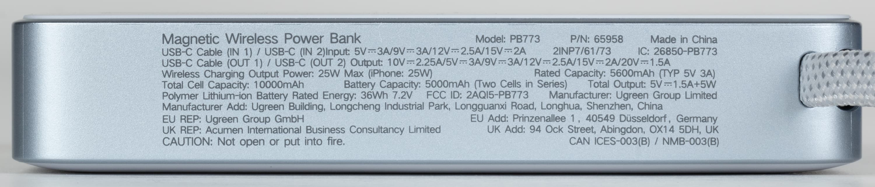 Одна из больших плоскостей корпуса — это поверхность взаимодействия (Interface Surface, термин из спецификации Qi). На ней обозначены окружности, соответствующие позиции катушки, и нанесен значок «Qi2 25W», свидетельствующий о соответствующей сертификации в WPC. Там же имеются сильные магниты, обеспечивающие удержание и правильное позиционирование при беспроводном заряде устройств, поддерживающих Qi2.