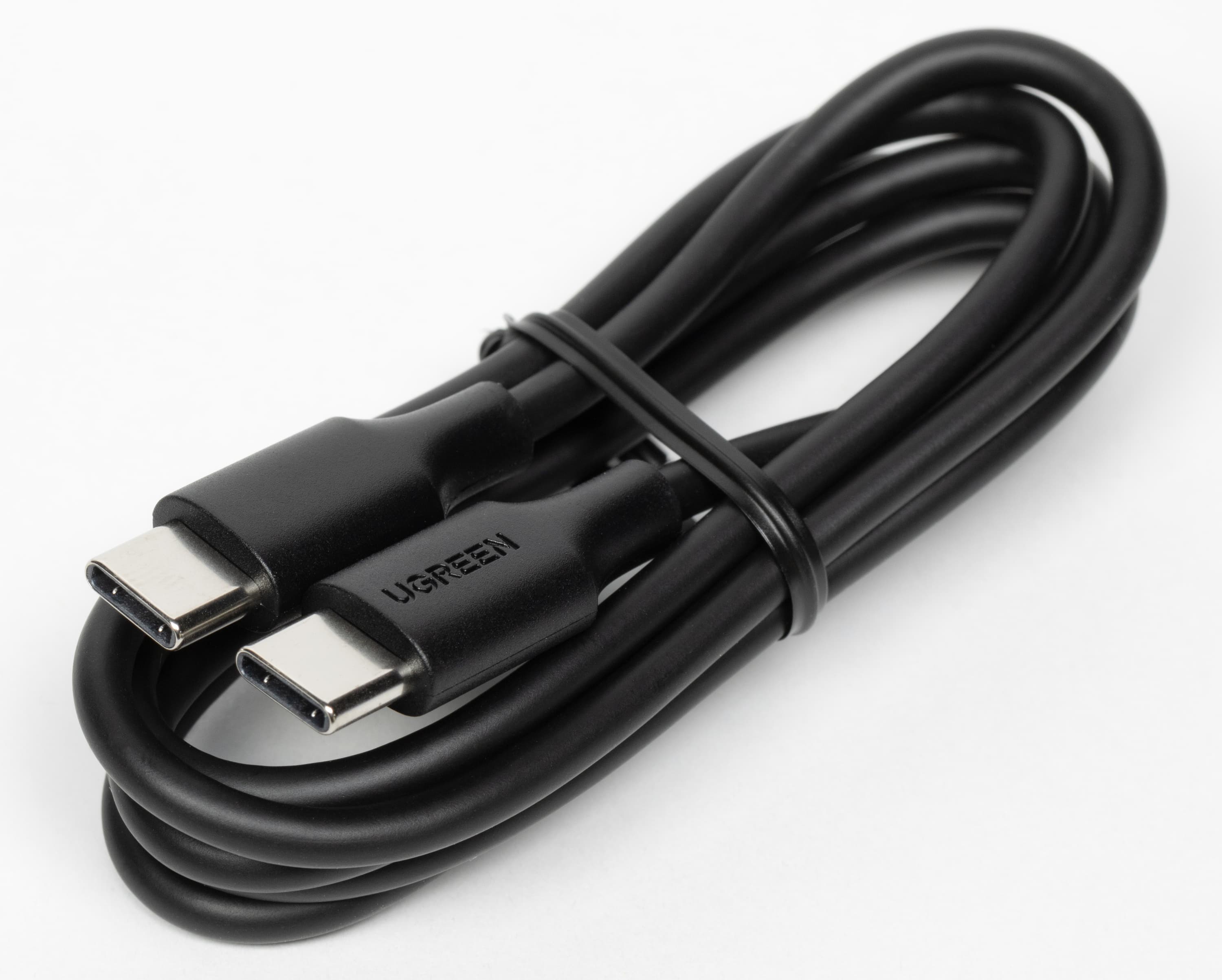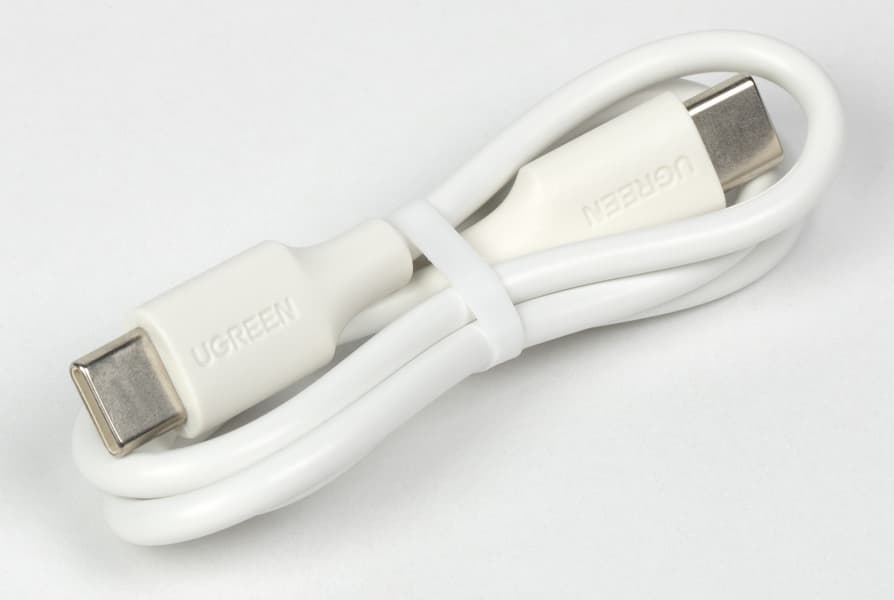 В комплекте имеется кабель длиной 1 метр с разъемами USB Type-C (male), имеющими отметки «Ugreen». К сожалению, на нем нет маркировки, свидетельствующей о сечении проводов.