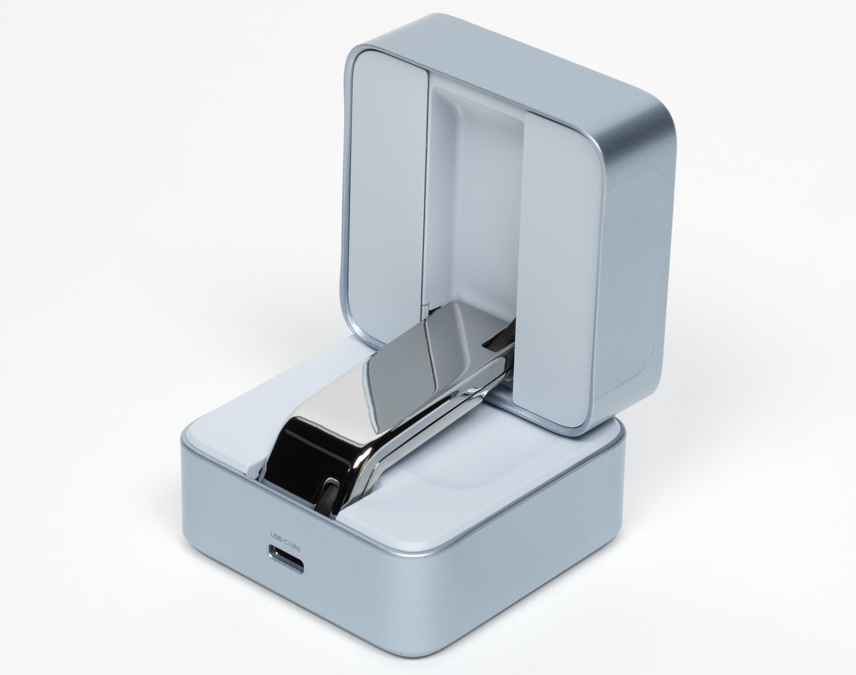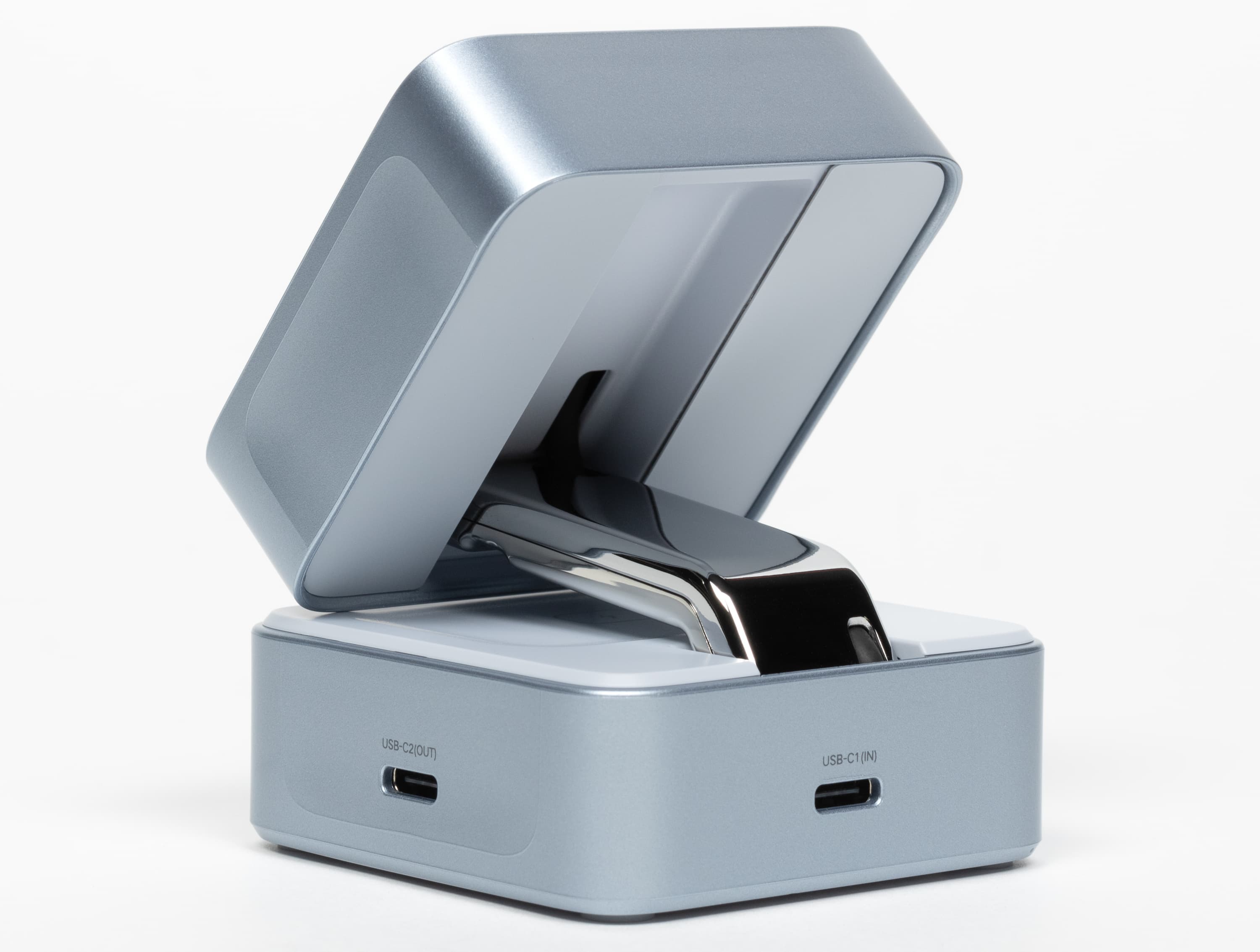 На передней поверхности нижней части имеется единственный индикатор, голубым цветом показывающий наличие беспроводного заряда, на задней — входной разъем USB-C female для подключения к внешнему ЗУ (сетевому или пауэрбанку, индикатор после соединения дважды мигает), на правой — выход USB-C female, от которого можно питать нагрузки с проводным подключением, но с весьма ограниченной мощностью (например смарт-часы).