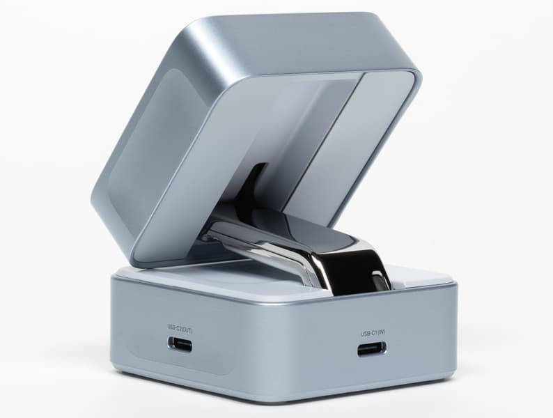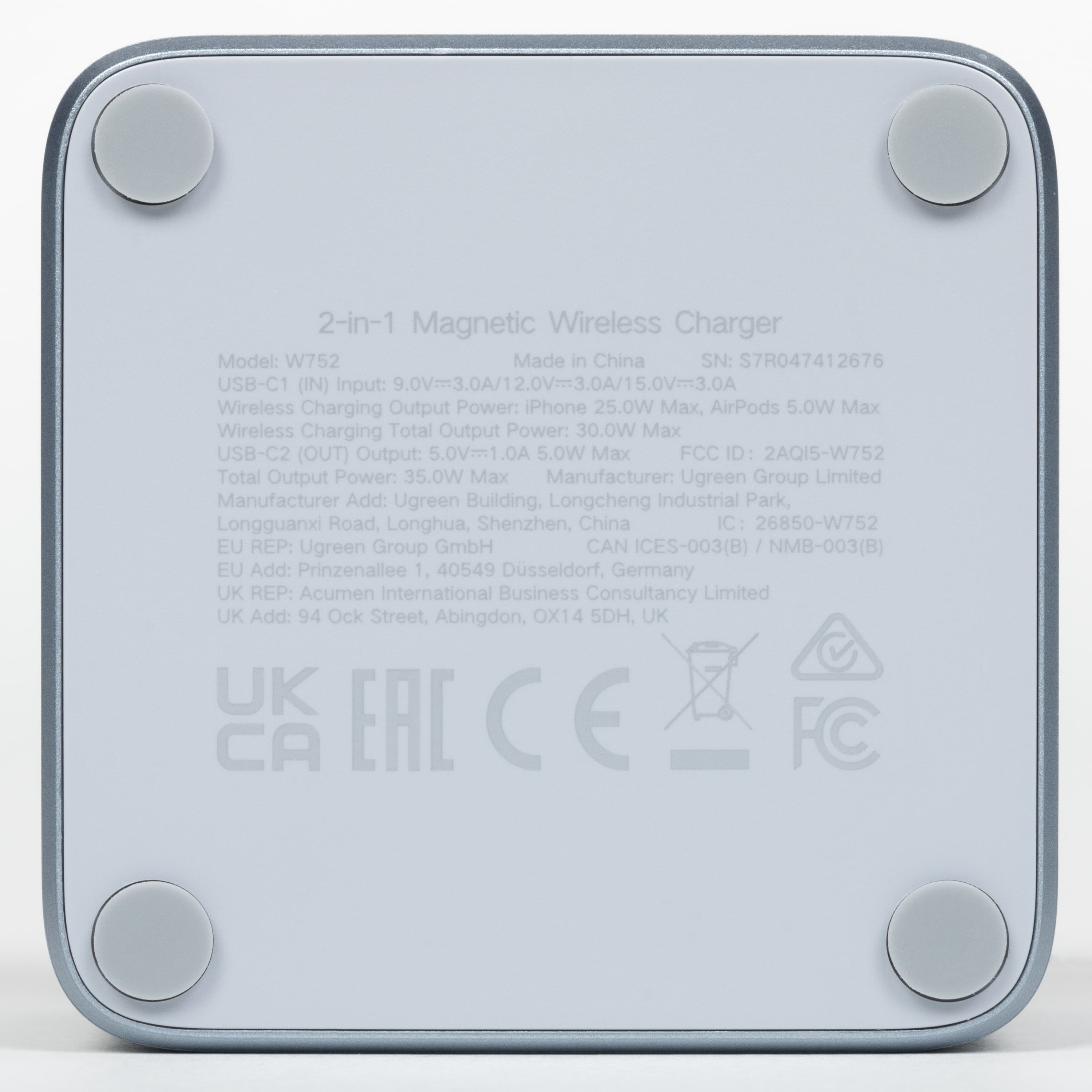 При этом обе половины оснащены поверхностями взаимодействия, отличающимися по мощности: у верхней, оснащенной шестнадцатью магнитами для удержания смартфонов Qi2, предел 25 ватт; на ней обозначены окружности, соответствующие позиции катушки, и нанесен значок «Qi2 25W», свидетельствующий о соответствующей сертификации в WPC.