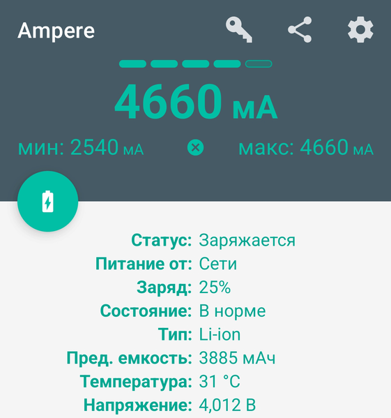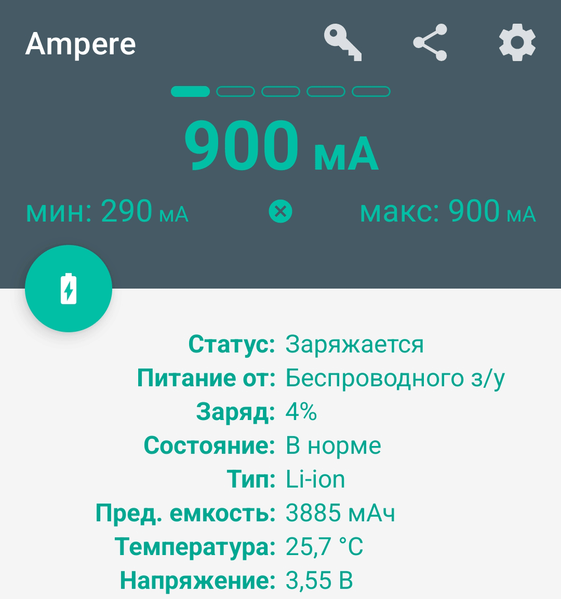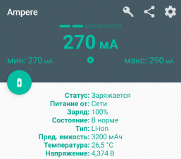 Лишь потом снижение тока стало заметным: до 650-660 мА через 2 часа 56 минут при 90% заряда. Значение 100% появилось через 3 часа 35 минут, но ток еще был в пределах 250-270 мА, и статус «Заряжено» мы увидели через 3 часа 56 минут после начала.