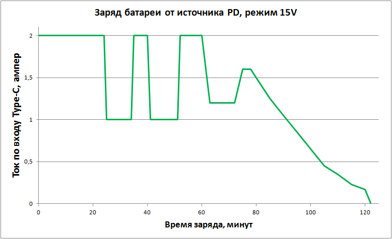 Поначалу, как и заявлено, ток держится на уровне 2 ампер (то есть потребление 30 Вт). А потом начинаются непонятные колебания: ток вдруг снижается вдвое, затем опять повышается до прежнего уровня, и так дважды. На стандартный алгоритм заряда литий-ионных батарей CCCV не очень-то похоже.