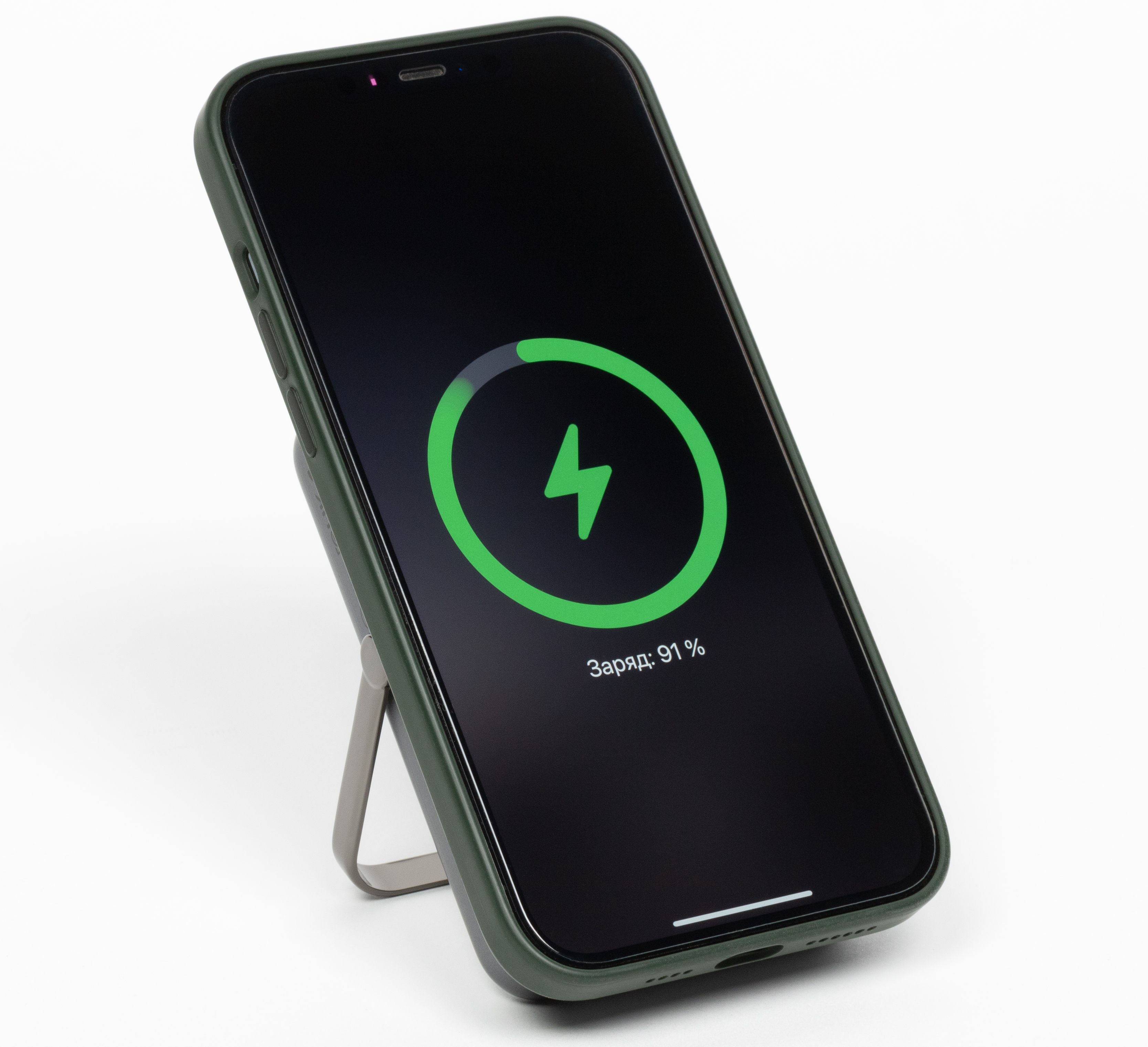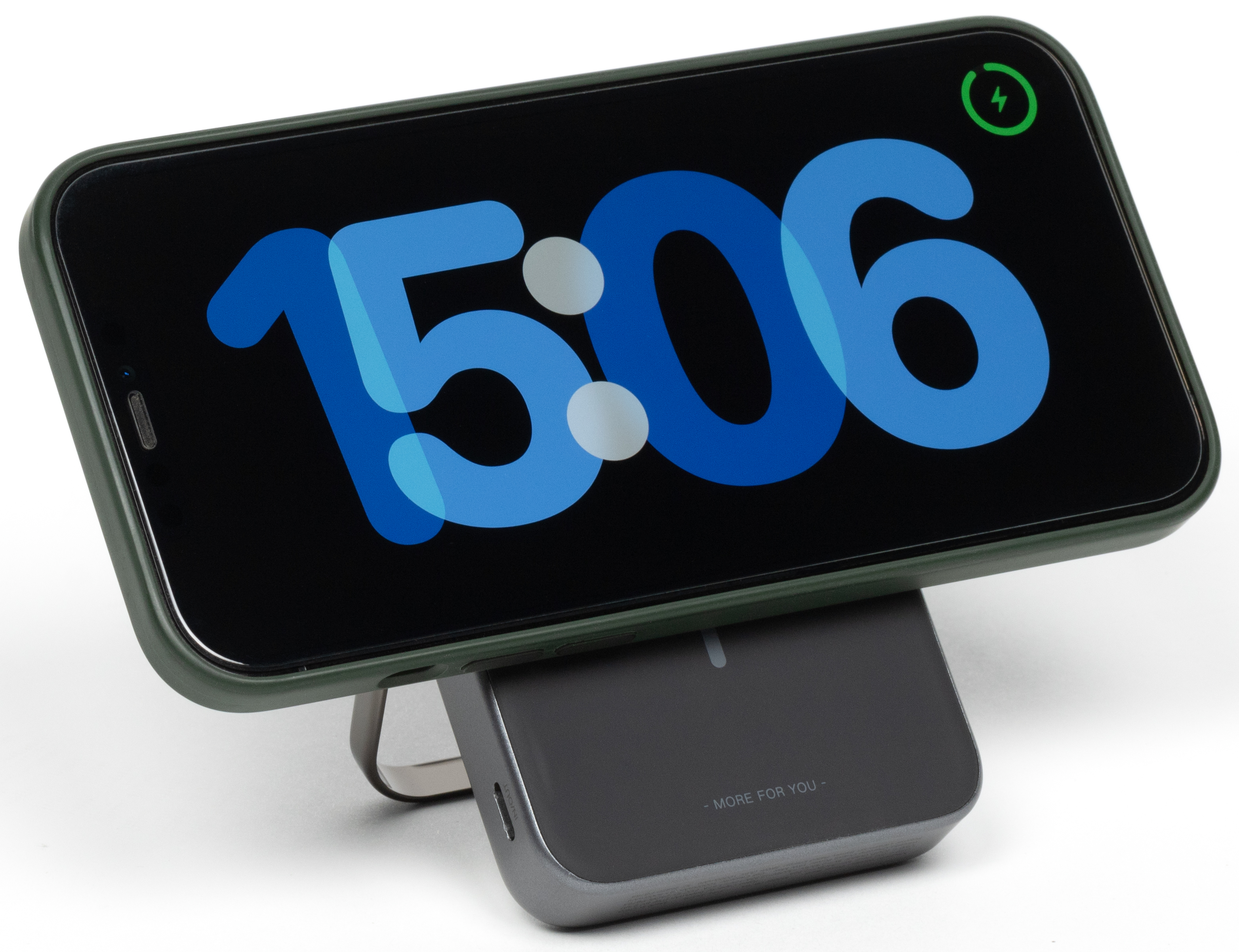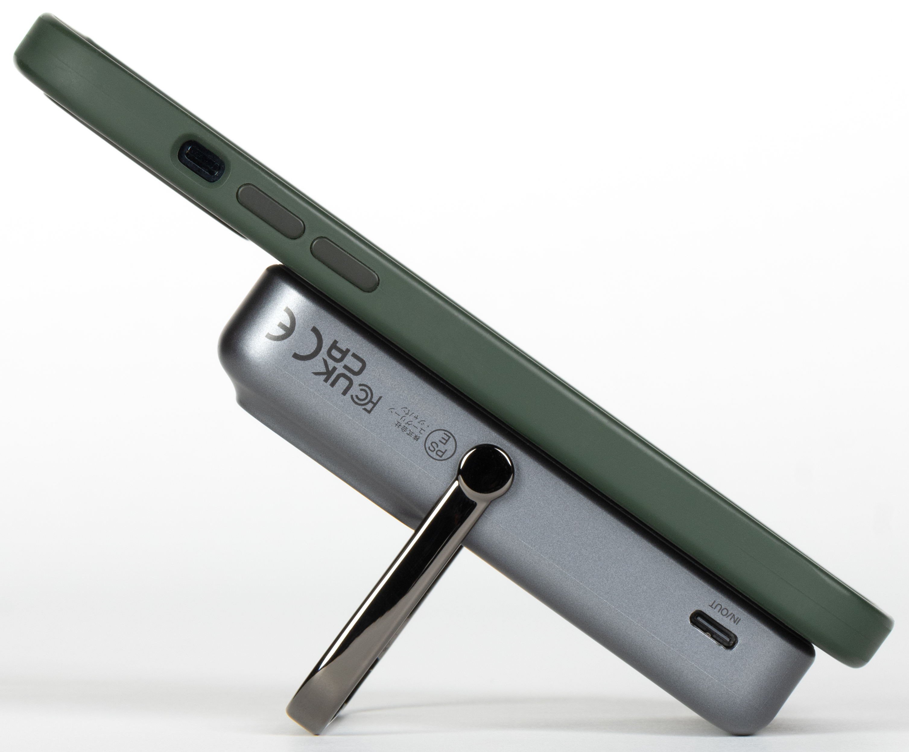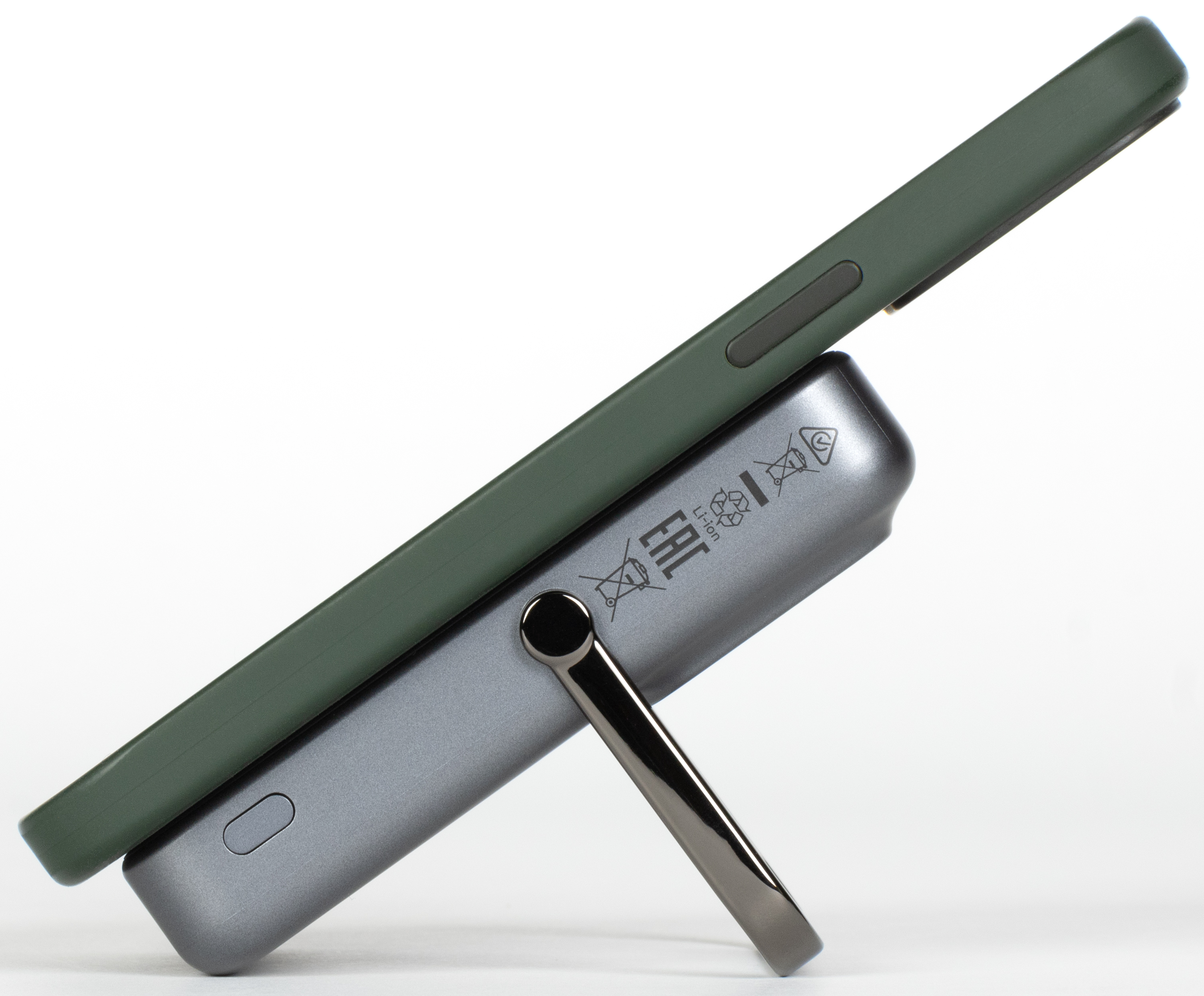 Положение соединенных магнитами устройств при этом может быть не только горизонтальным, но и с наклоном, если использовать поворотную опору пауэрбанка — получается удобная подставка, с которой смартфон не соскользнет.