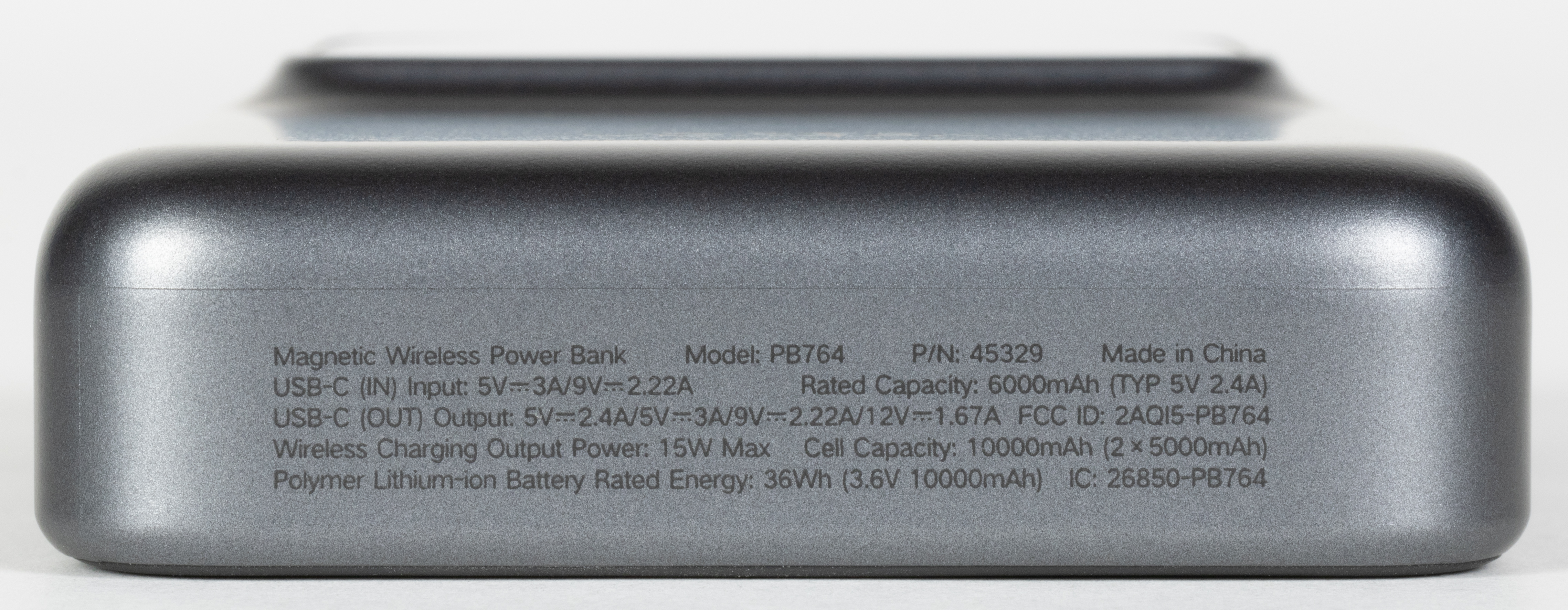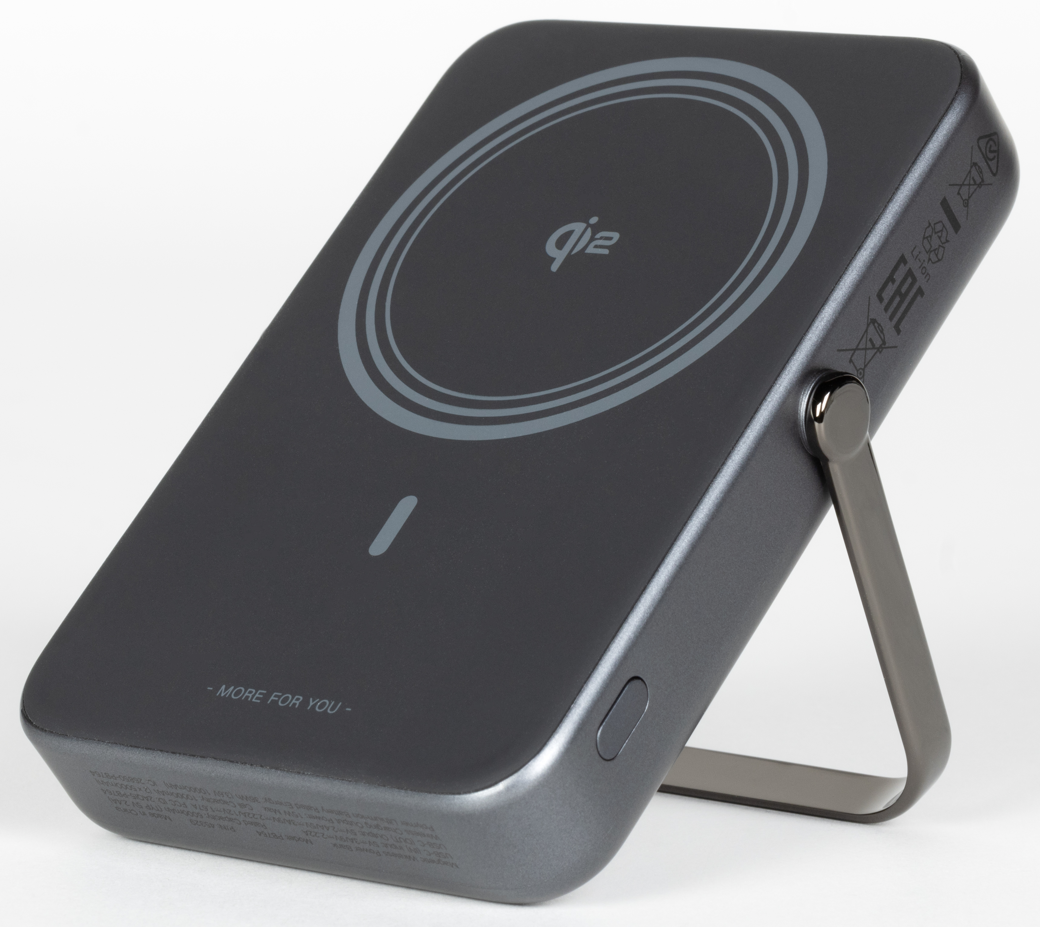 Противоположная плоскость корпуса — это поверхность взаимодействия (Interface Surface, термин из спецификации Qi). Ее бархатистое матовое покрытие напоминает soft-touch, обозначены окружности, соответствующие позиции катушки, имеется значок «Qi2», свидетельствующий о соответствующей сертификации в WPC. Там же имеются сильные магниты, обеспечивающие удержание и правильное позиционирование при беспроводном заряде устройств, поддерживающих Qi2.