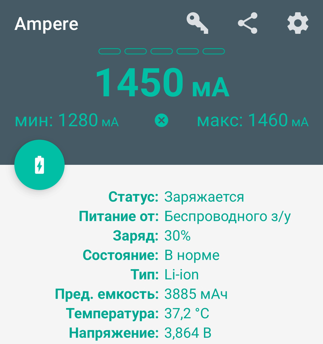 Задействуется 9-вольтовый режим, потребляемый смартфоном ток в начале процесса достигает 1,2-1,3 А, при этом приложение Ampere показывает, что аккумулятор заряжается током около 2,4 ампера (начинает понемногу снижаться лишь через 40-45 минут); температура была немного меньше, чем при беспроводной зарядке — в пределах 38 °C.