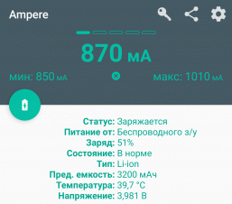Задействуется 9-вольтовый режим, потребляемый смартфоном ток в начале процесса достигает 1,6 А и держится на этом уровне более часа. При этом приложение Ampere показывает, что аккумулятор заряжается током около 3,1 ампера (начинает понемногу снижаться лишь через 45-50 минут); тем не менее, температура была заметно меньше, чем при беспроводной зарядке — в пределах 37 °C.