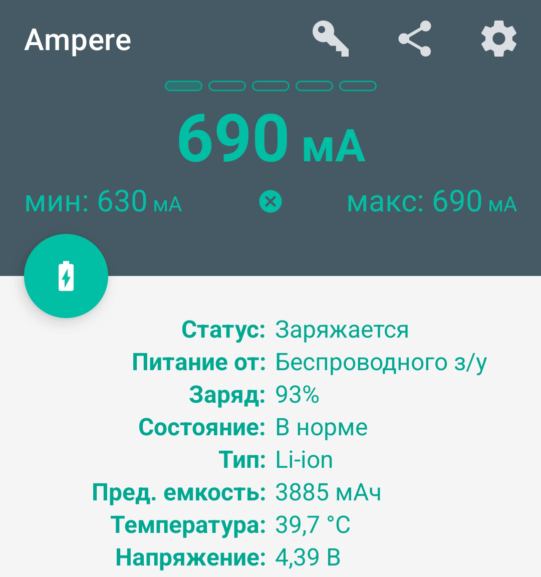 Для достижения заряда в 100% потребовалось 6 часов 10 минут, но ток еще был заметным: 270-430 мА (3,5-5,3 Вт), и лишь еще через 23 минуты в приложении Ampere статус «Заряжается» сменился на «Заряжена».