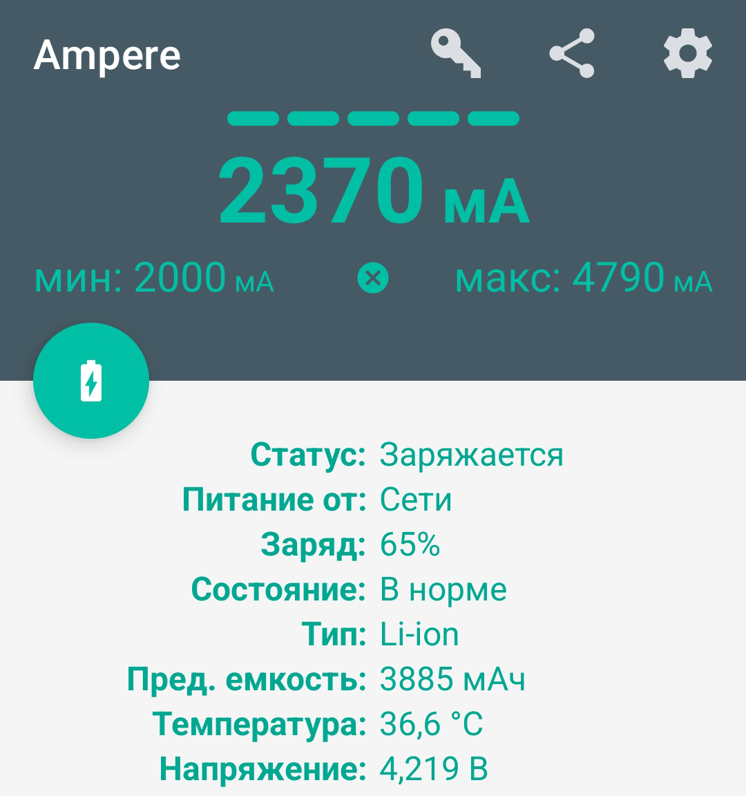 Его аккумулятор с заявленной емкостью 4000 мА·ч (в Ampere отображается 3885 мА·ч) предварительно разрядили почти полностью (остаток 1-2%); он был без SIM-карты, с включенными интерфейсами связи Wi-Fi и Bluetooth (но без установленных подключений), экран периодически включался со средней яркостью для контроля процесса заряда