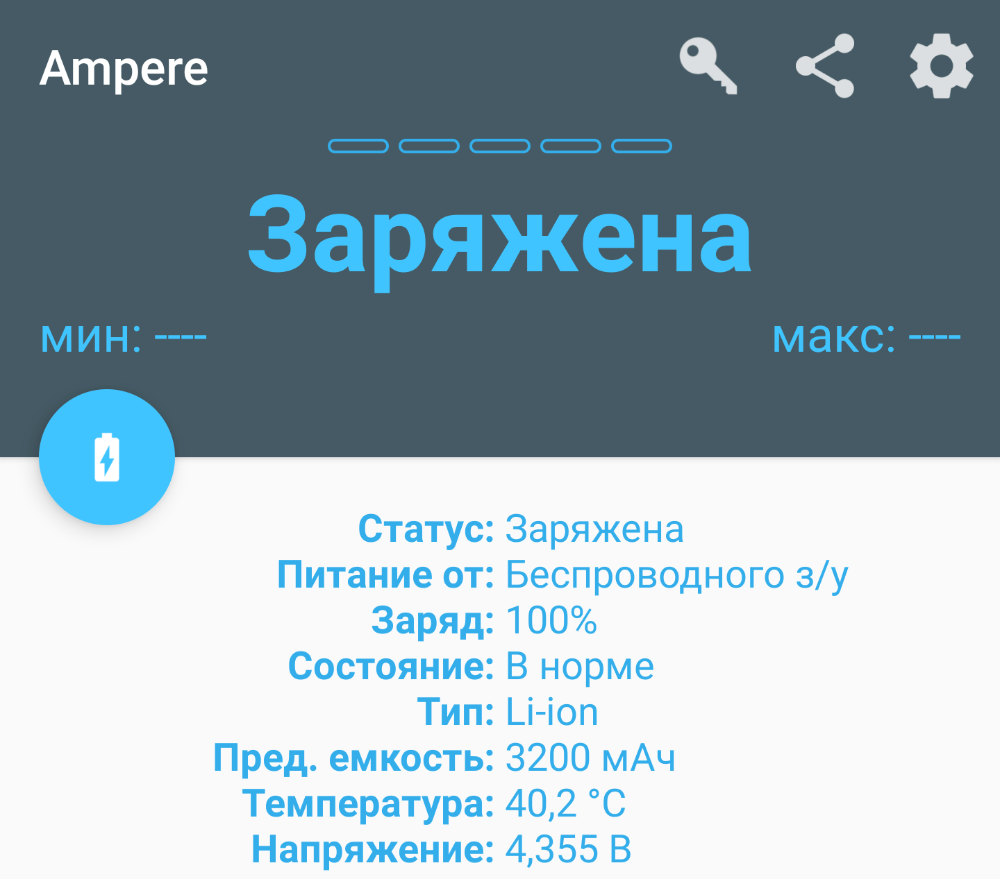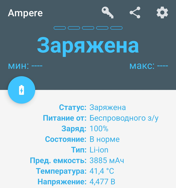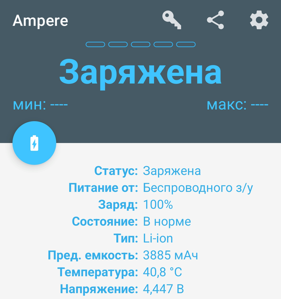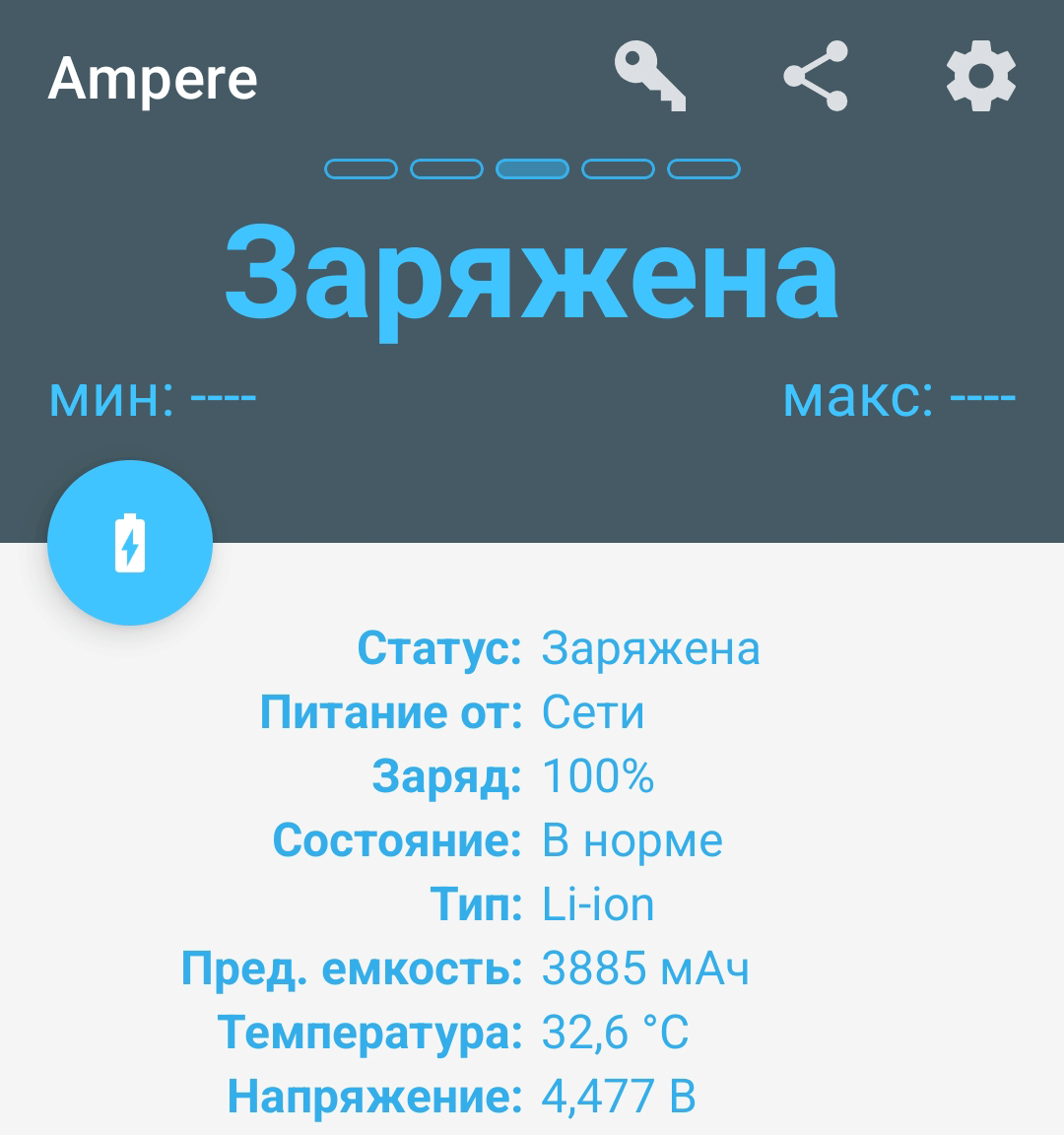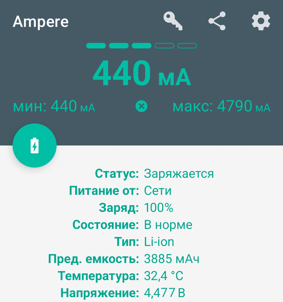 Через 1 час 27 минут от начала заряда приложение Ampere показало заряд в 100%, ток аккумулятора еще был около 440 мА. Через минуту статус «Заряжается» сменился на «Заряжена».
