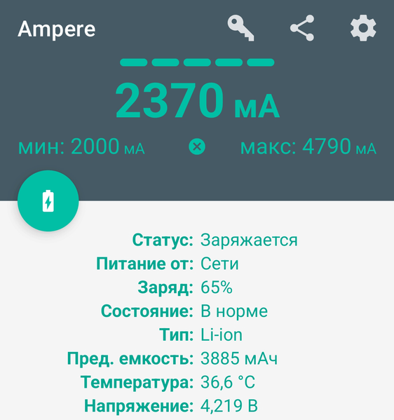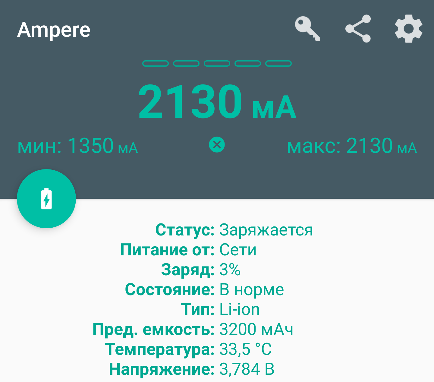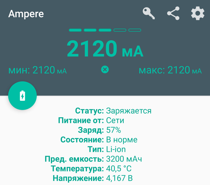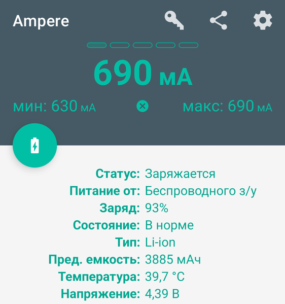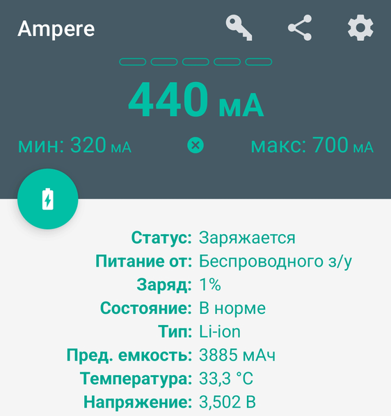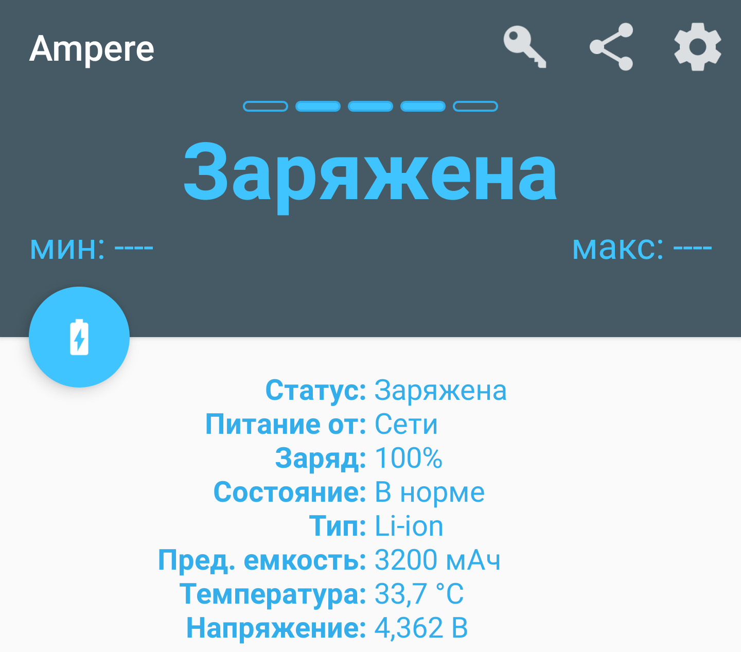 Через 1 час 27 минут от начала заряда приложение Ampere показало заряд в 100%, ток аккумулятора еще был около 440 мА. Через минуту статус «Заряжается» сменился на «Заряжена».